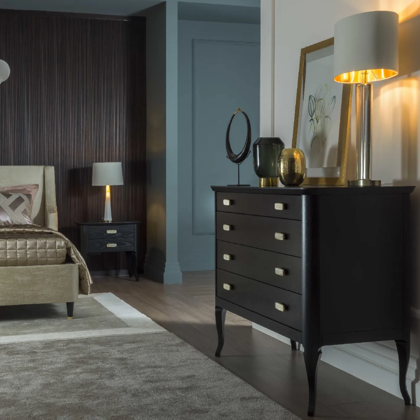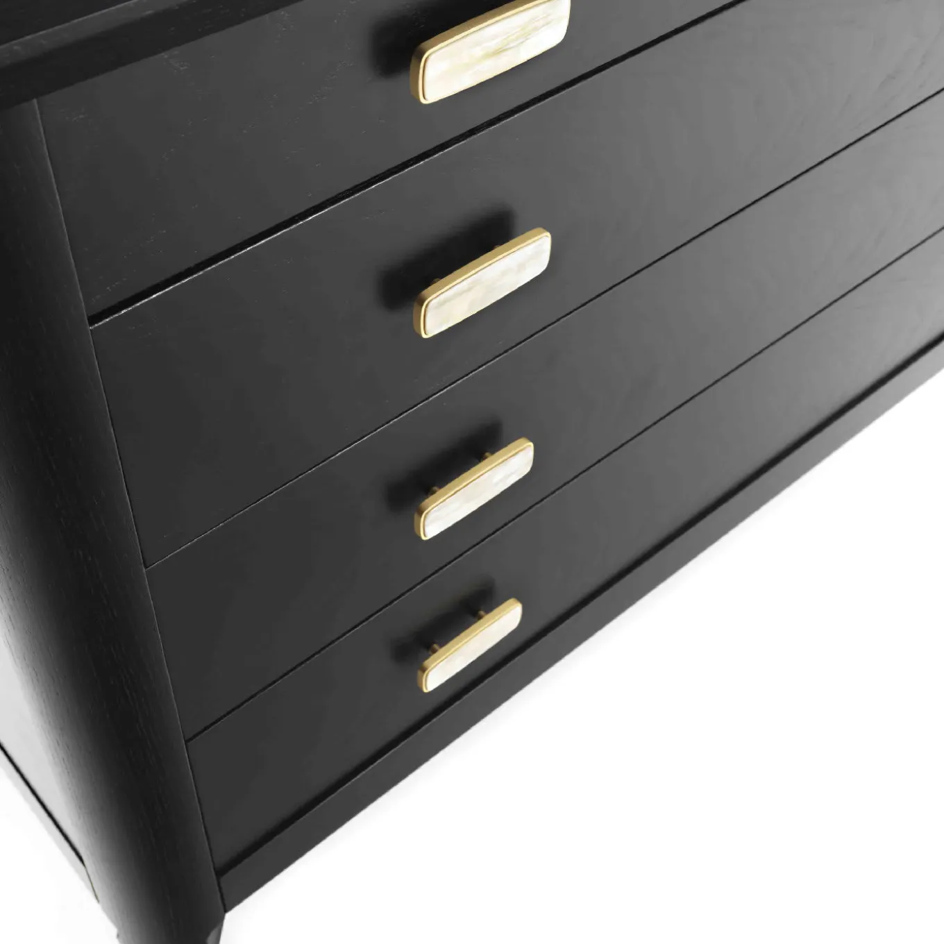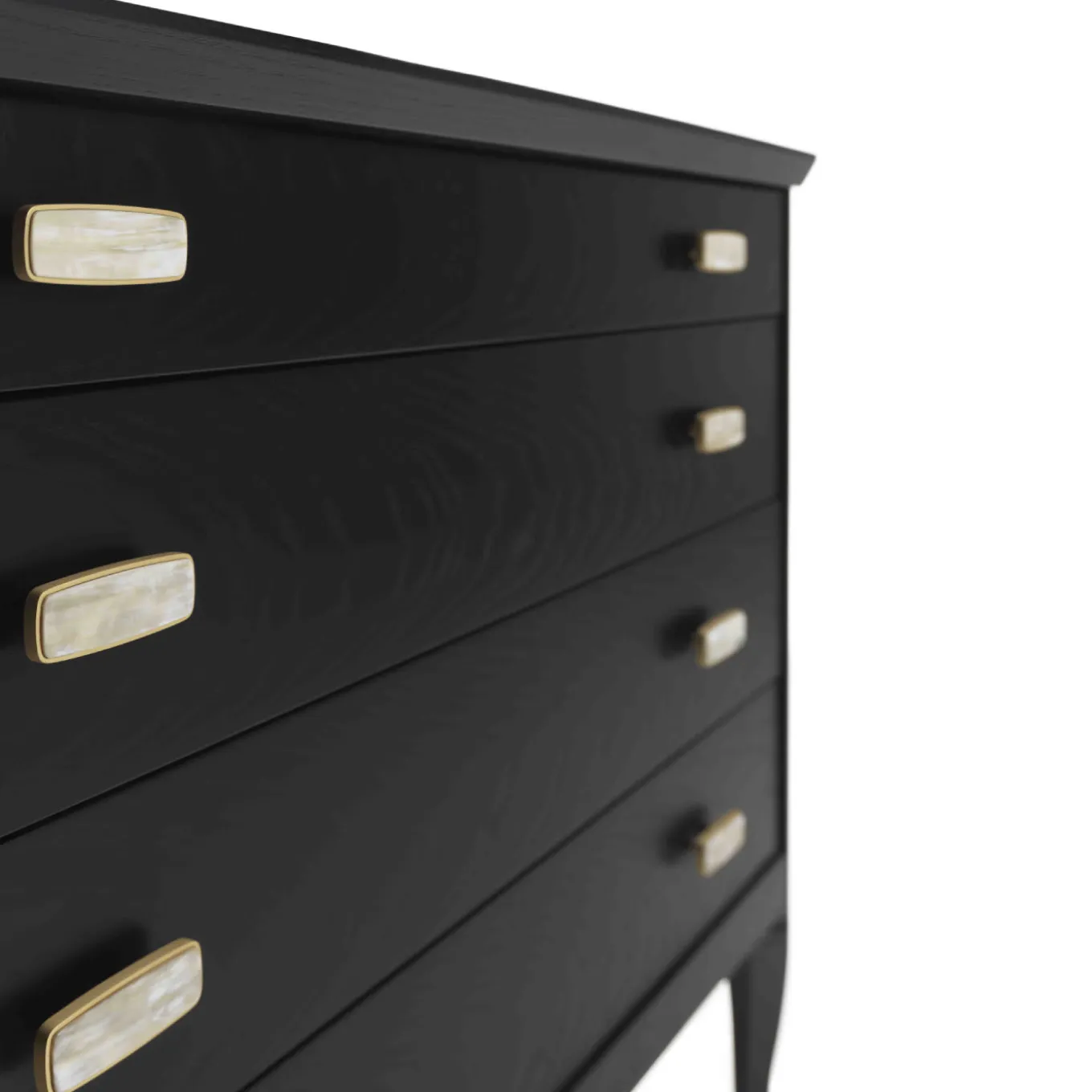 Minimal aesthetic and functional design define this exquisite chest of drawers that will fit perfectly in a modern and classic living room or bedroom. Supported by an ash-veneered wooden frame with an ebonized finish, this dresser has rounded sides and a stunning top with extended, rounded rim supported by cabriole-style legs. Evoking the elegance of classic furniture, this piece showcases two elegant Art Deco brass handles with buffalo horn inserts on each of the four drawers featuring soft close Blumotion technology. This simple yet chic design will elevate the style of any interior decor.