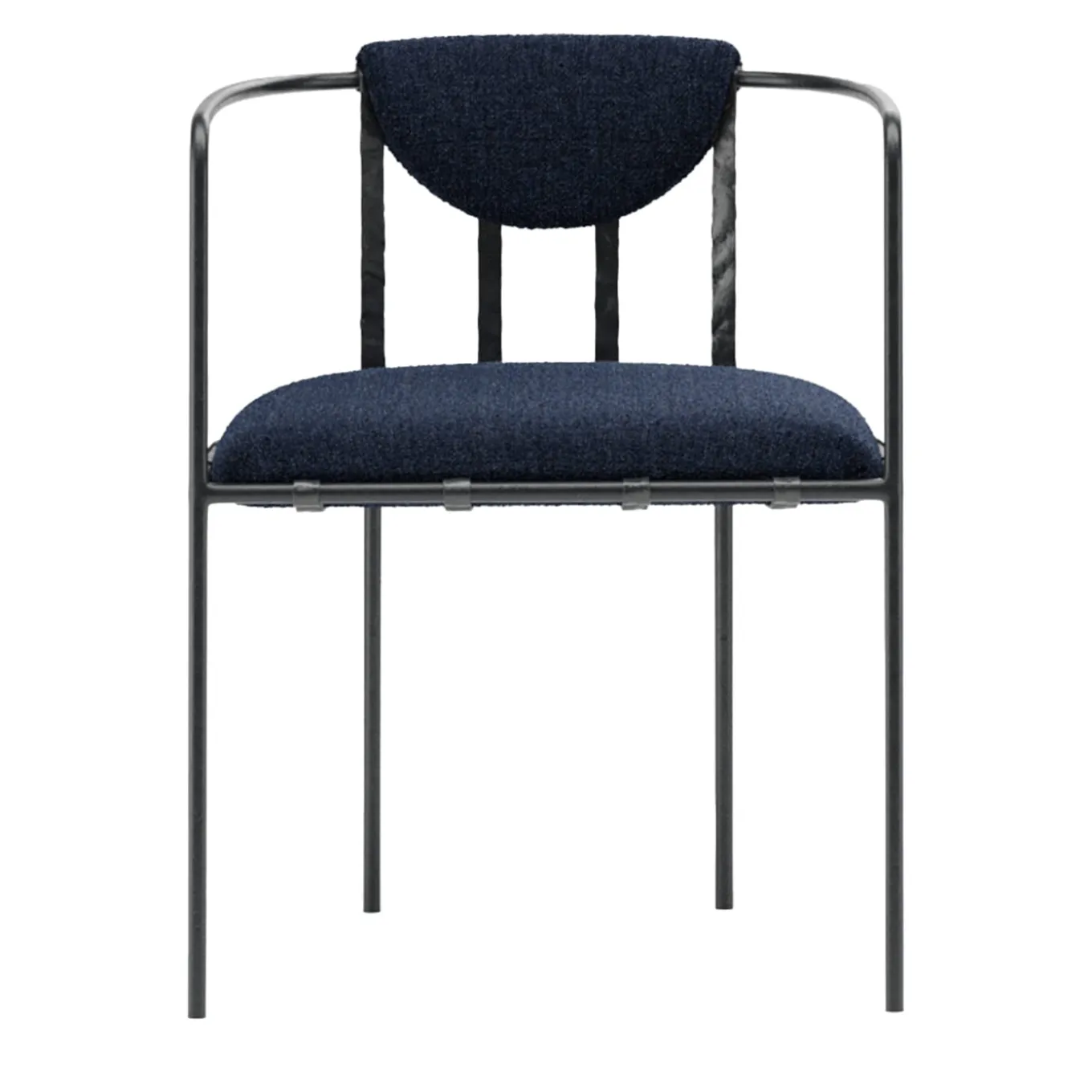 An elegant and glamorous accent to sophisticated contemporary decor, this chair is a timeless design by creative director Margherita Rui. Deftly handmade of metal, softly padded, and upholstered with a black fabric on the seat and backrest. Please consult the Artemest catalog for other designs from the Dolmen Collection.