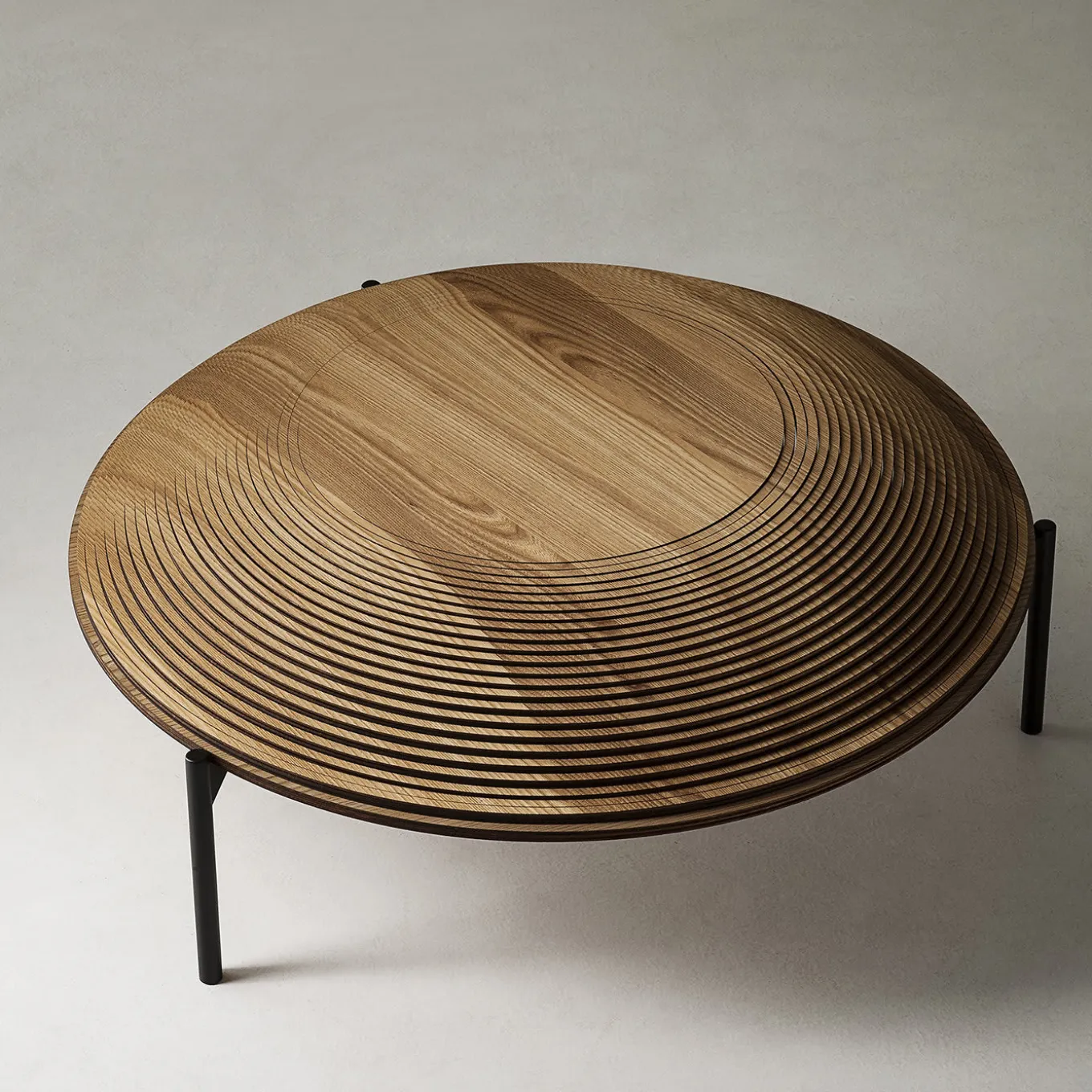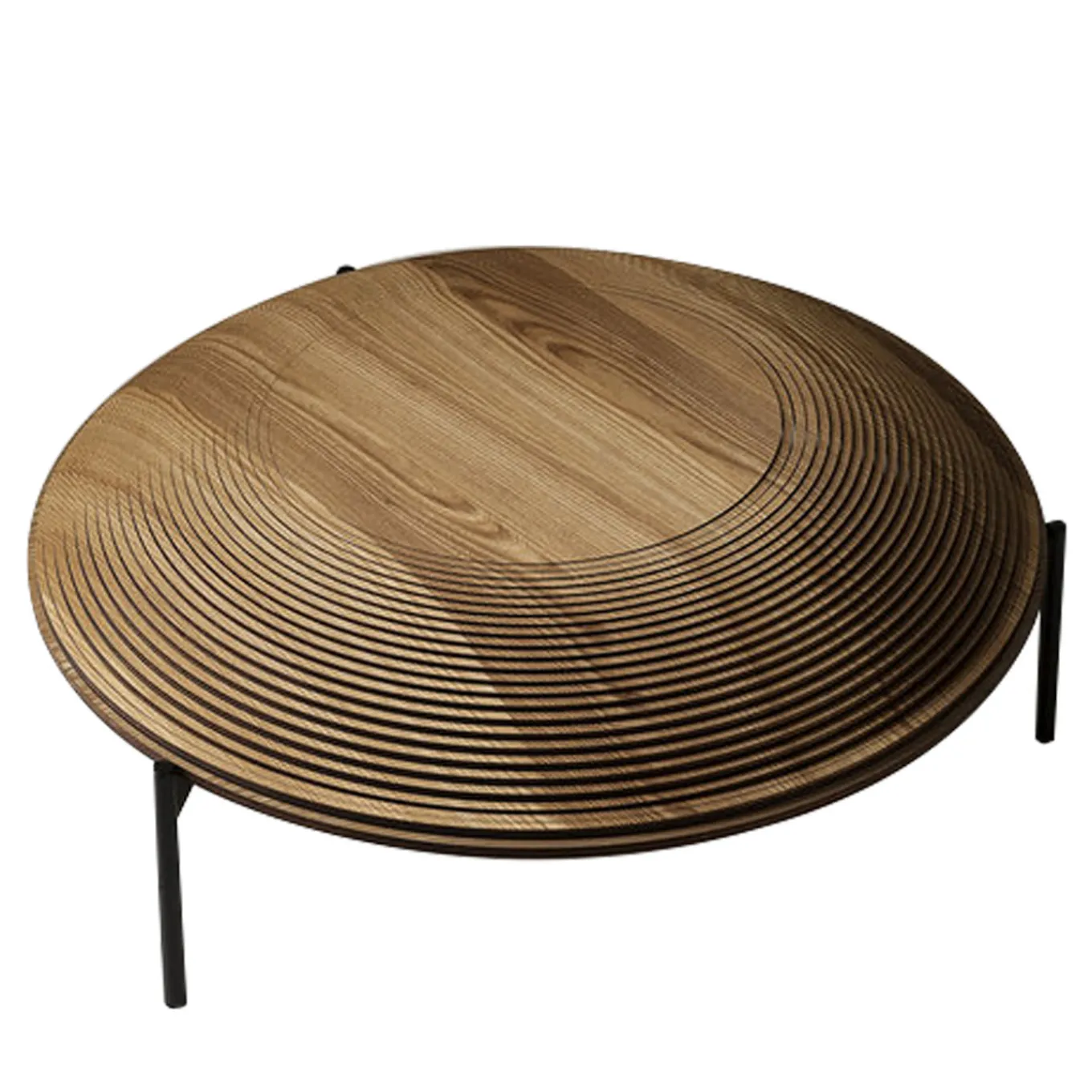 The complex workmanship of the micro-tiered, dome atop this elm-veneered plywood coffee table creates a three-dimensional, architectural effect, enhanced by the item’s legs, which recall thin, painted metal columns. Form and function meld completely into a single piece of furniture. It is available on request in different widths, heights and types of wood.