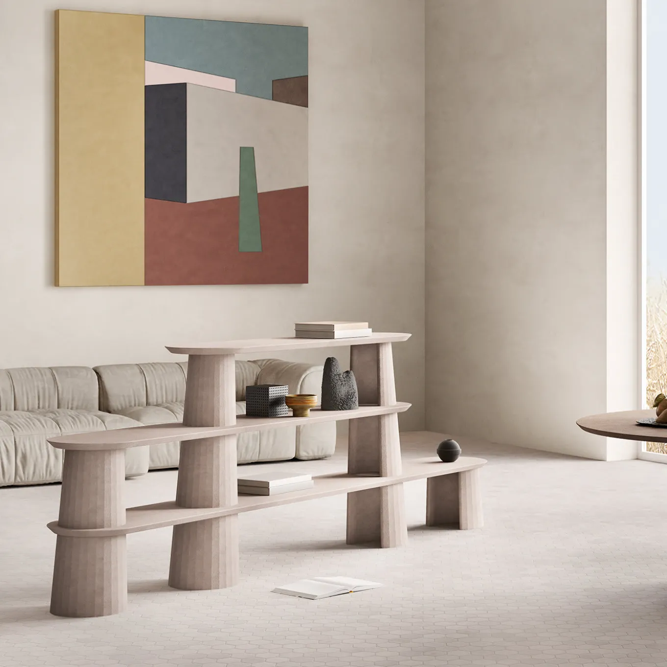 A striking work of art that pays tribute to the surrealism, primitivism, metaphysics, and brutalism art movements, this wall moodboard combines geometric volumes of strong architectural value enhanced with a captivating interplay of lights and shadows. Designed by Marialaura Rossiello Irvine for Forma&Cemento’s Fusto Collection, it is entirely made of concrete. The image depicts a small parallelepiped immersed in an ensemble of tall and thick volumes marked by red, petrol green, and gray hues. Other sizes are available upon request to the Concierge.