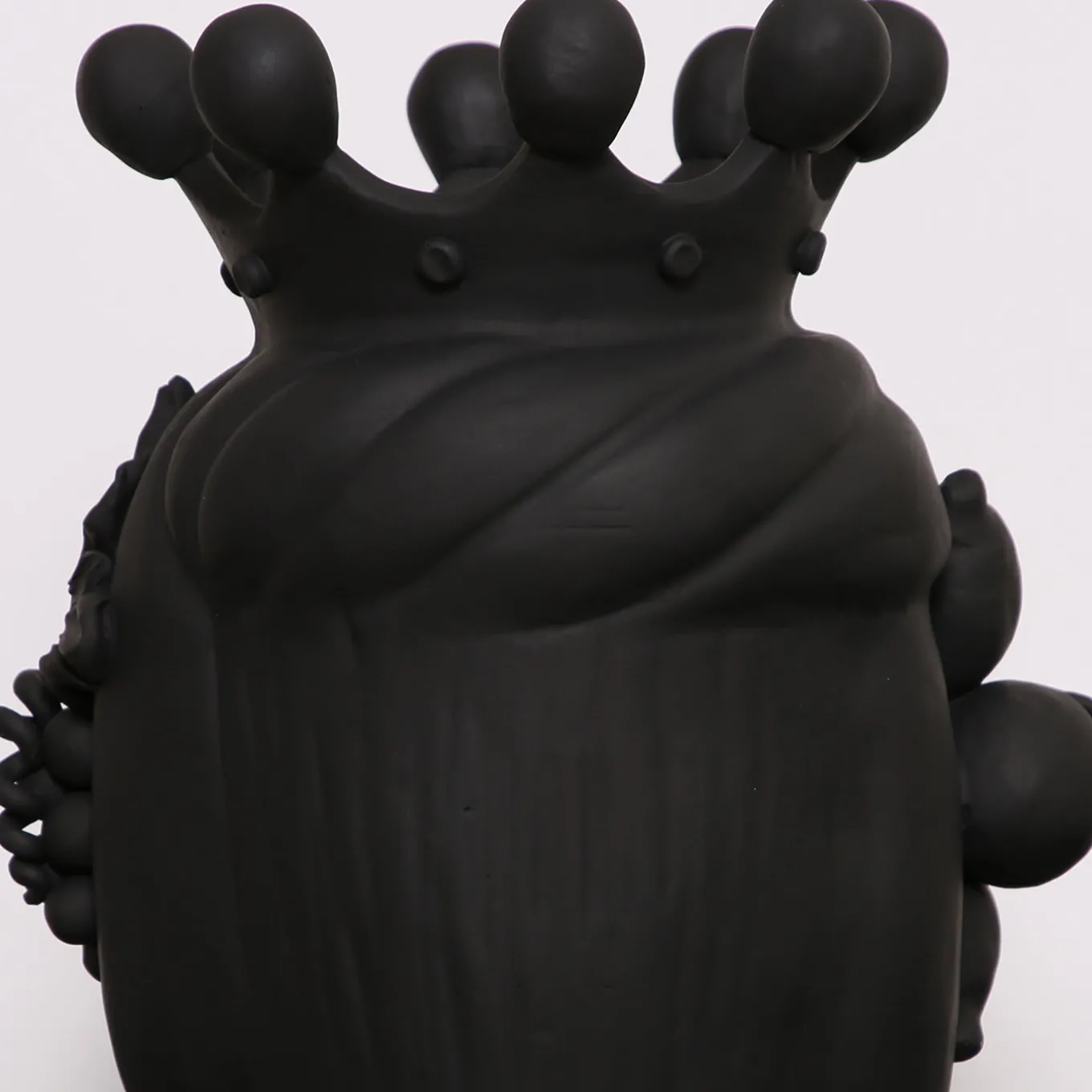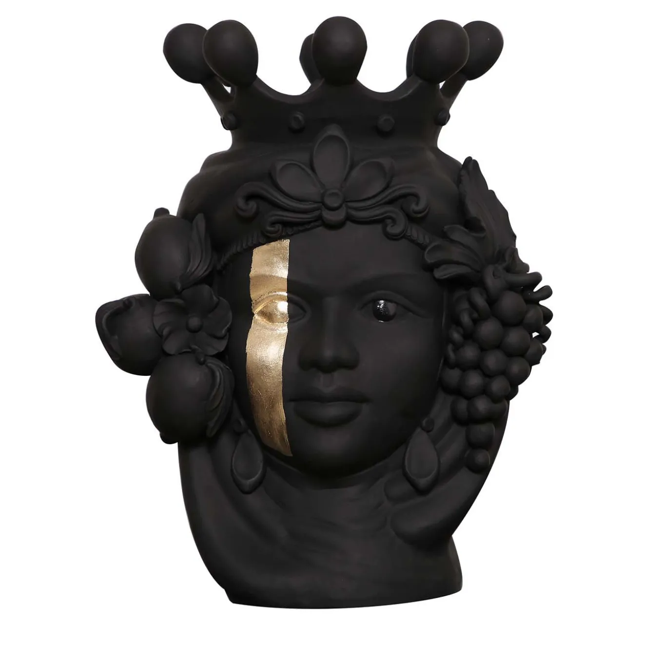 A captivating ode to traditional craftsmanship and modern sensibility, this anthropomorphic vase of a Sicilian woman recalls the grandeur of Sicily’s Arab domination. Crafted with care by master ceramicist Stefania Boemi, this piece is hand glazed in a deep black matte hue and boasts an expressive visage with an ornate headdress and crown flanked by locks of hair intertwined with Sicilian lemons. One of the eyes features a gold foil band running vertically down the face, striking touch, emphasizing the beauty of the woman’s gaze. The vase cannot be filled with water.
