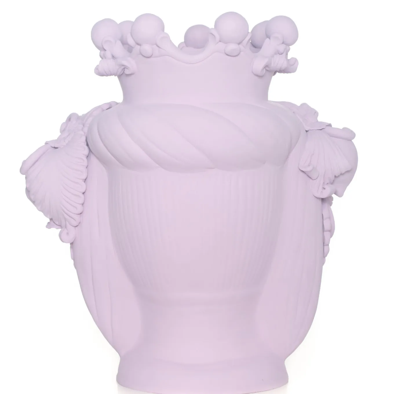 This anthropomorphic vase is made entirely by hand and painted in a antique pink matte monochrome tint, rich in natural pigments and resin binders that provide intense color depth. Only the eyes are glazed so they stand out, emphasizing the beauty of the gaze. The piece is inspired by ancient Sicilian legends of love and revenge between a Moor and a Maiden. The vase cannot be filled with water.