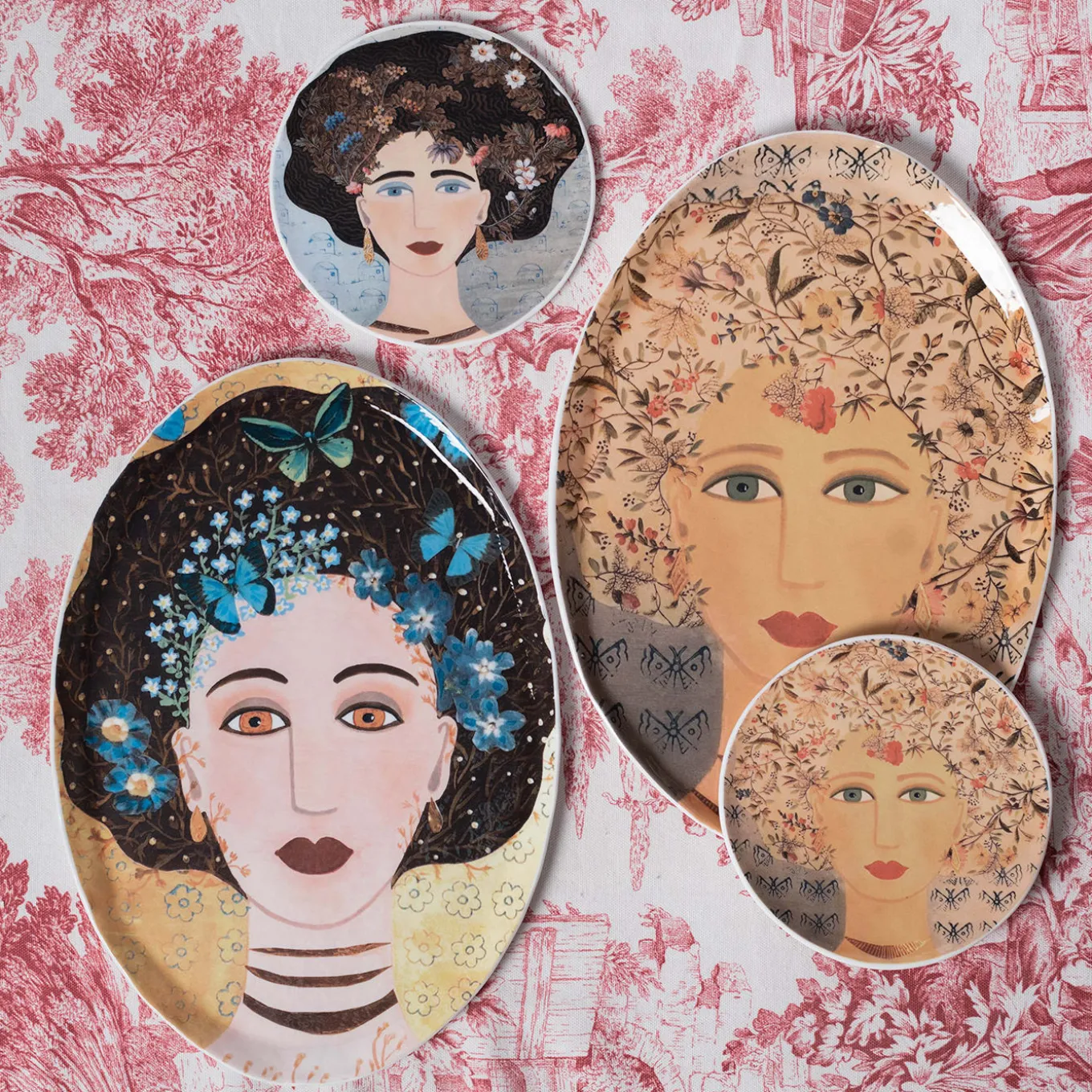 Donne Fiorite is a special collection realized in partnership with the artist AdC (Anna de Carlo), who first painted these ladies on canvas. Each with her own name and personality, their portraits are transferred on Murano Glass with a decalco technique. Available sizes: Plate Ø 14cm, Plate Ø 28cm, Oval Tray 20x14cm, Oval Tray 30x21cm, Oval Tray 40x28cm. Please ask the Concierge for details.