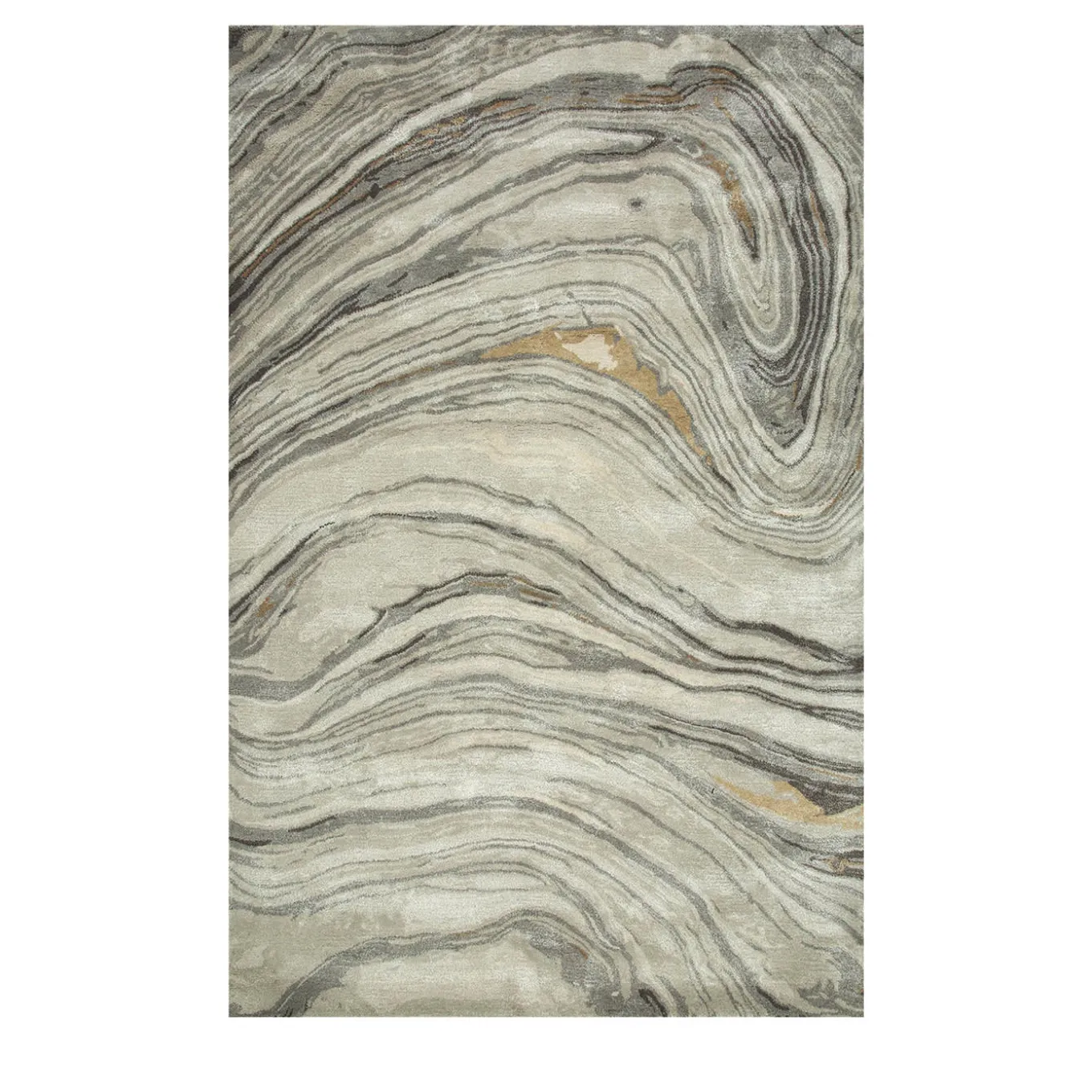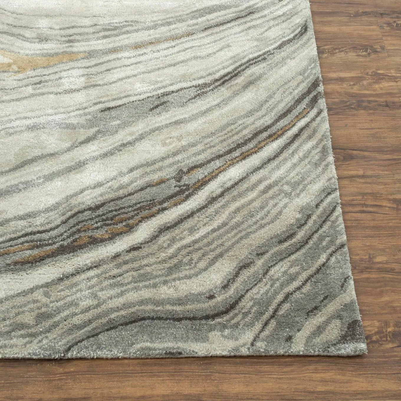 This hand-tufted designer rug blends 50% wool and 50% viscose, offering warmth, durability, and a subtle sheen with luxurious softness. The rug features an organic pattern inspired by natural geological formations, resembling sedimentary rock striations or agate swirls. The color palette, with various shades of grey and hints of beige and taupe, adds subtle sophistication. It is available in diverse colors, shapes & sizes.