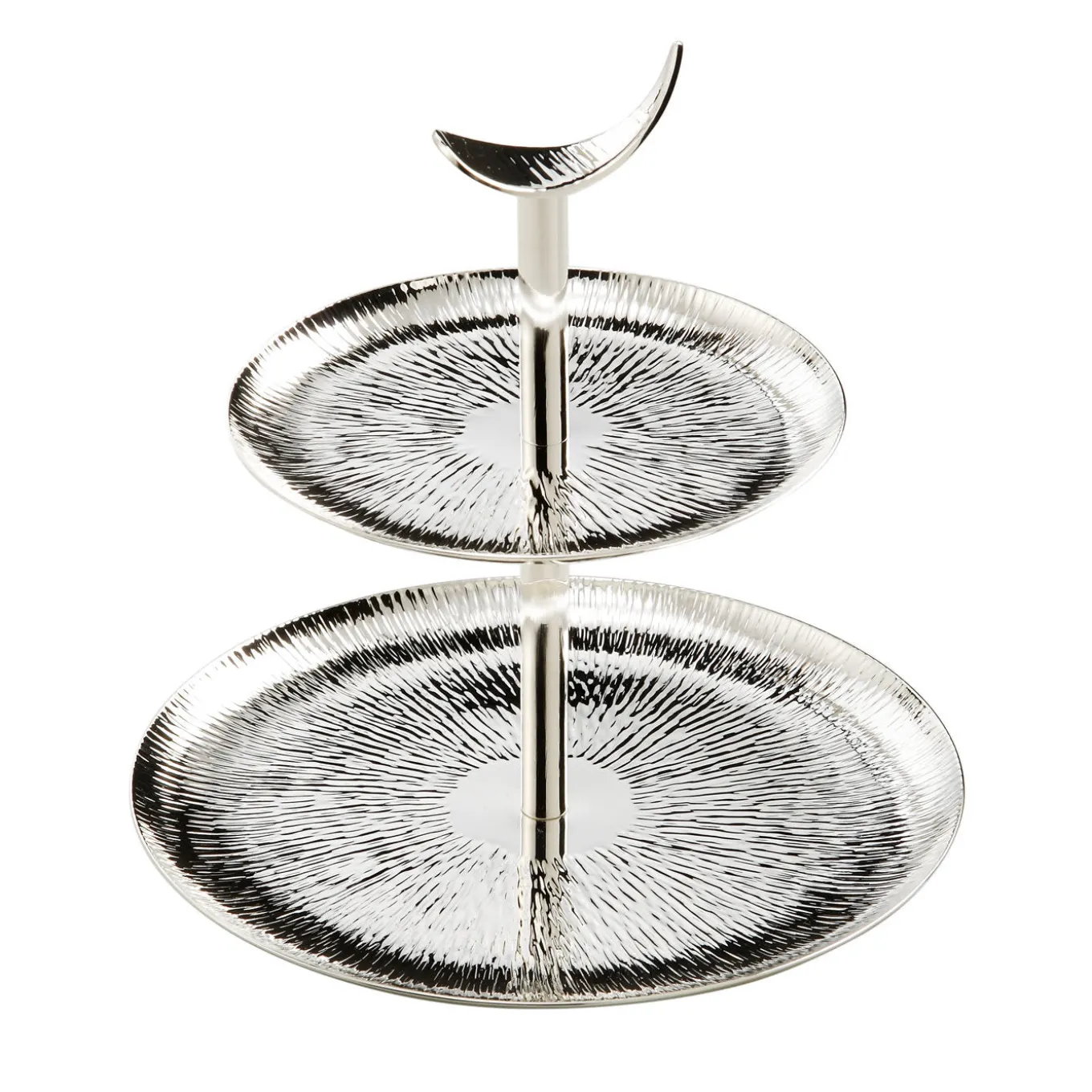 Elevated serving tray exquisitely crafted in a silver-plated alloy.