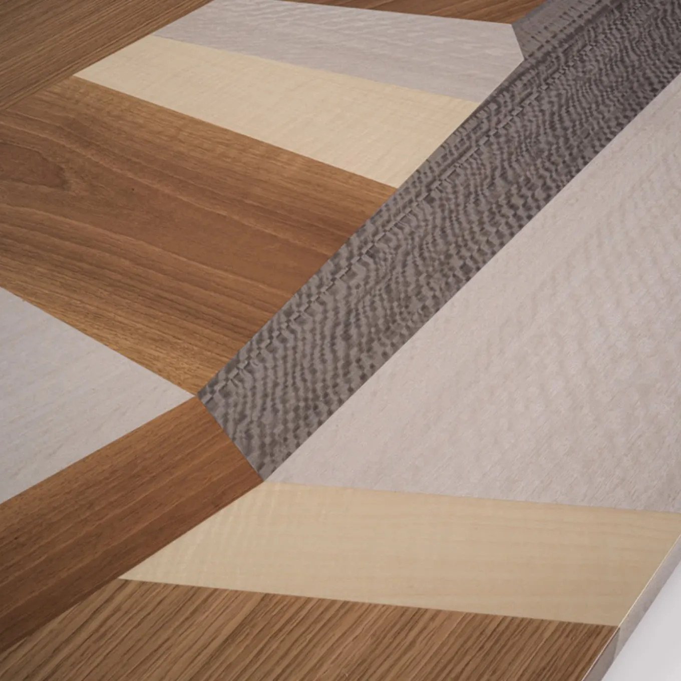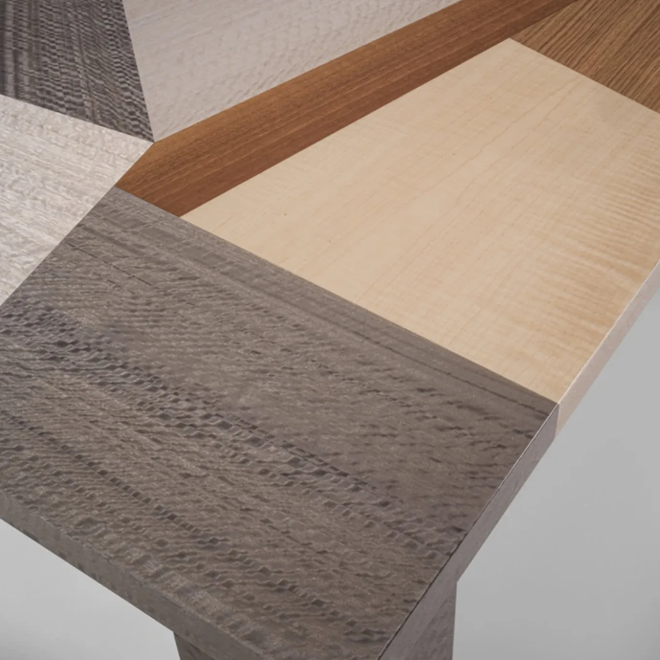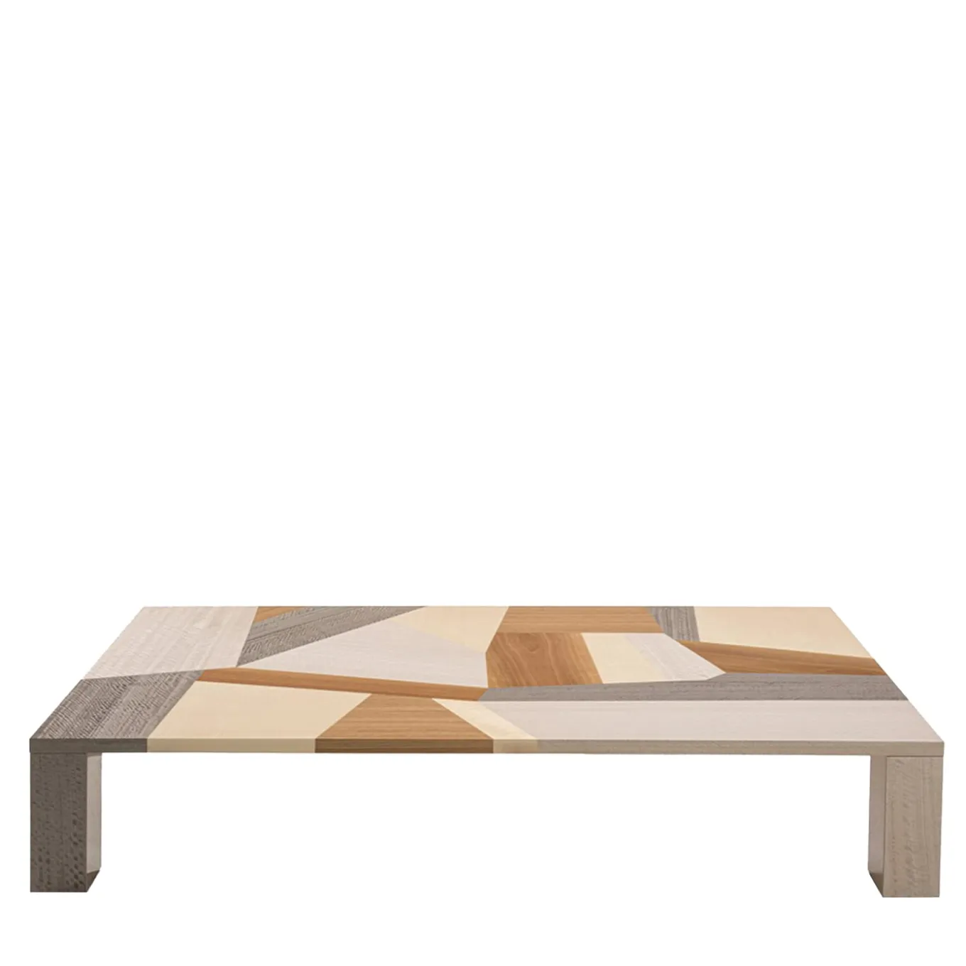 A clever arrangement of vibrant wood inlays in contrasting tones blending cool, neutral, and warm shades lends this coffee table its superb dynamism, emphasized by the inlays’ sharp and irregular cut. The extremely minimalist silhouette counterbalances the daring design, where nature – with its natural grain – meets unrivaled craftsmanship. The piece is enriched with a glossy finish.