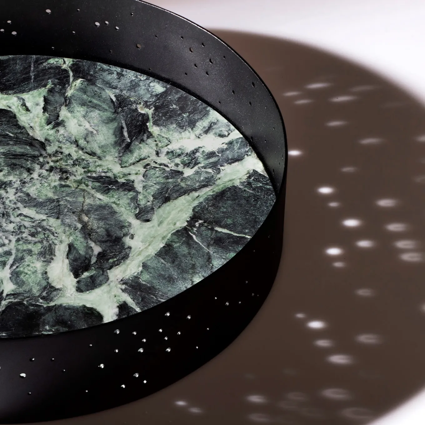 Stunning as a tray or centerpiece, this exclusive design was inspired by the ecliptic, the plane of Earth’s orbit around the Sun. The pattern of randomly distributed pierces gracing the metal frame symbolizes the myriad of stars from the Milky Way. The internal bottom in Verde Alpi marble confers a unique aesthetic and luxurious feel to the piece, which also comes in different marble variants upon request to the Concierge.