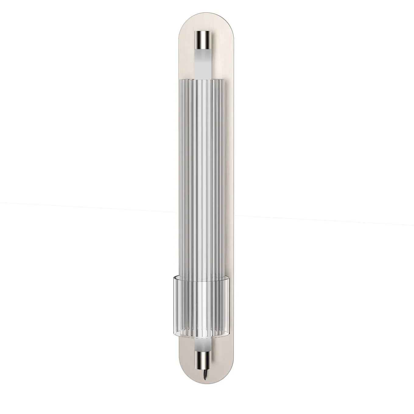 This piece features a sleek brushed steel structure supporting a frosted light tube encased by a series of glass rings. The design combines vertical textures and translucent elements to create a sophisticated wall fixture that offers diffused lighting with a contemporary aesthetic. Suitable for various interior settings, this sconce enhances ambient illumination while adding a refined architectural detail.