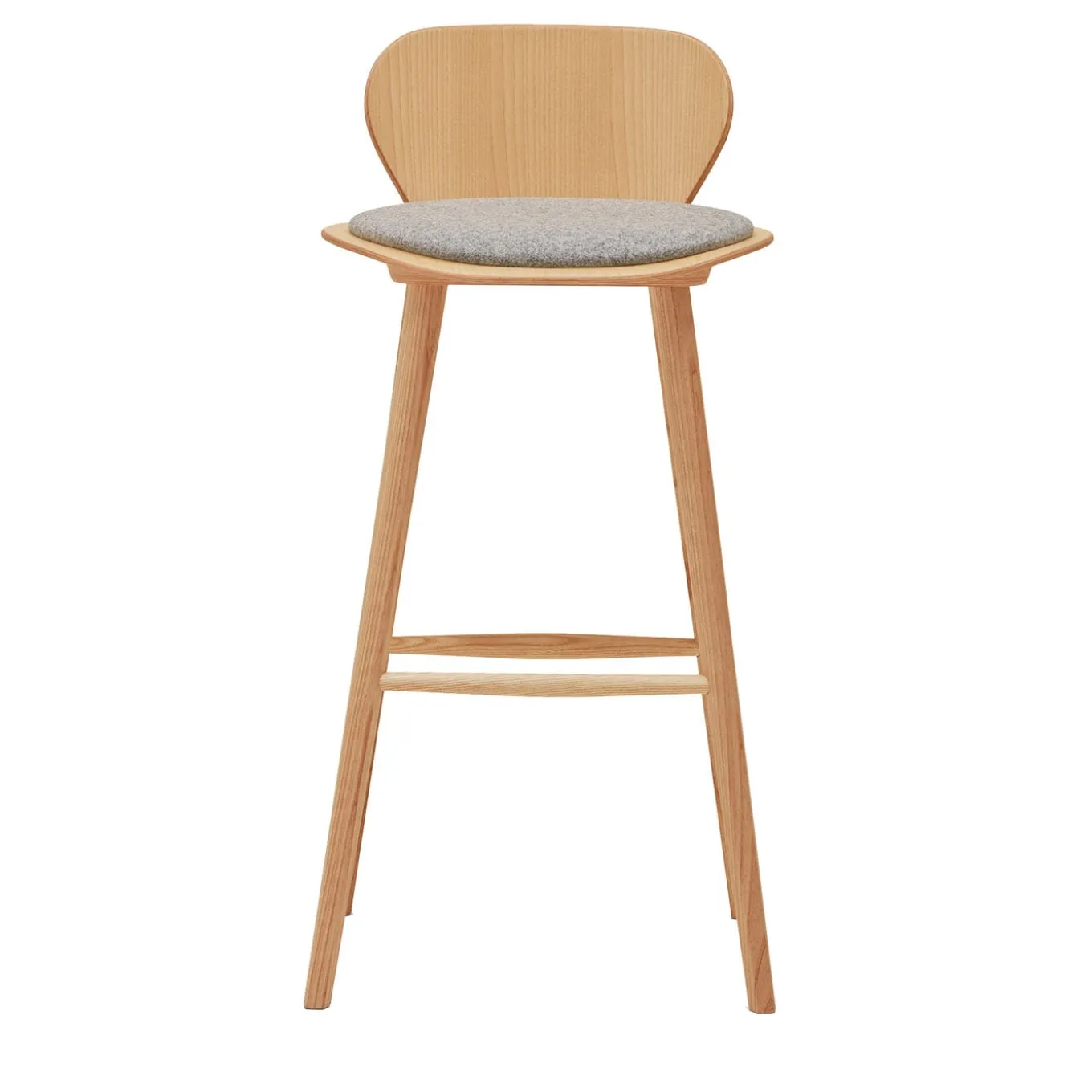 Clean and essential lines of Nordic inspiration define the sleek silhouette of this gorgeous stool designed by Philippe Bestenheider. Handmade of natural ash wood, it features four slim and slanted legs with a footrest supporting a curved seat upholstered with Flamenco gray fabric, completed with a likewise-shaped backrest. This is an ideal accent piece for both private and contract interior settings.