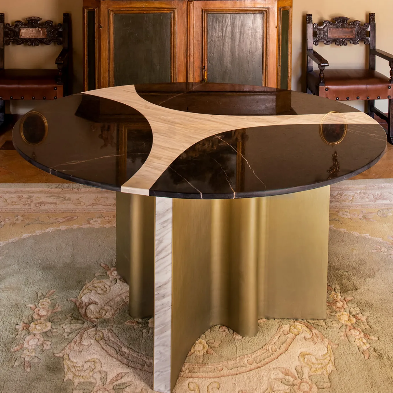 This dining table’s elegant silhouette merges sculpture with design. Three Calacatta Ondulato pillars support the round top, which is inlaid with a pattern of Calacatta Ondulato and Sahara marbles. The top pattern follows the shape of the base, made of metal sheets welded together. The base is in winter gold satin finish. The marble’s interplay of colors and textures creates a dramatic graphic contrast. Please, contact the Concierge for customization options. Due to the nature of the material, the product may slightly vary.
