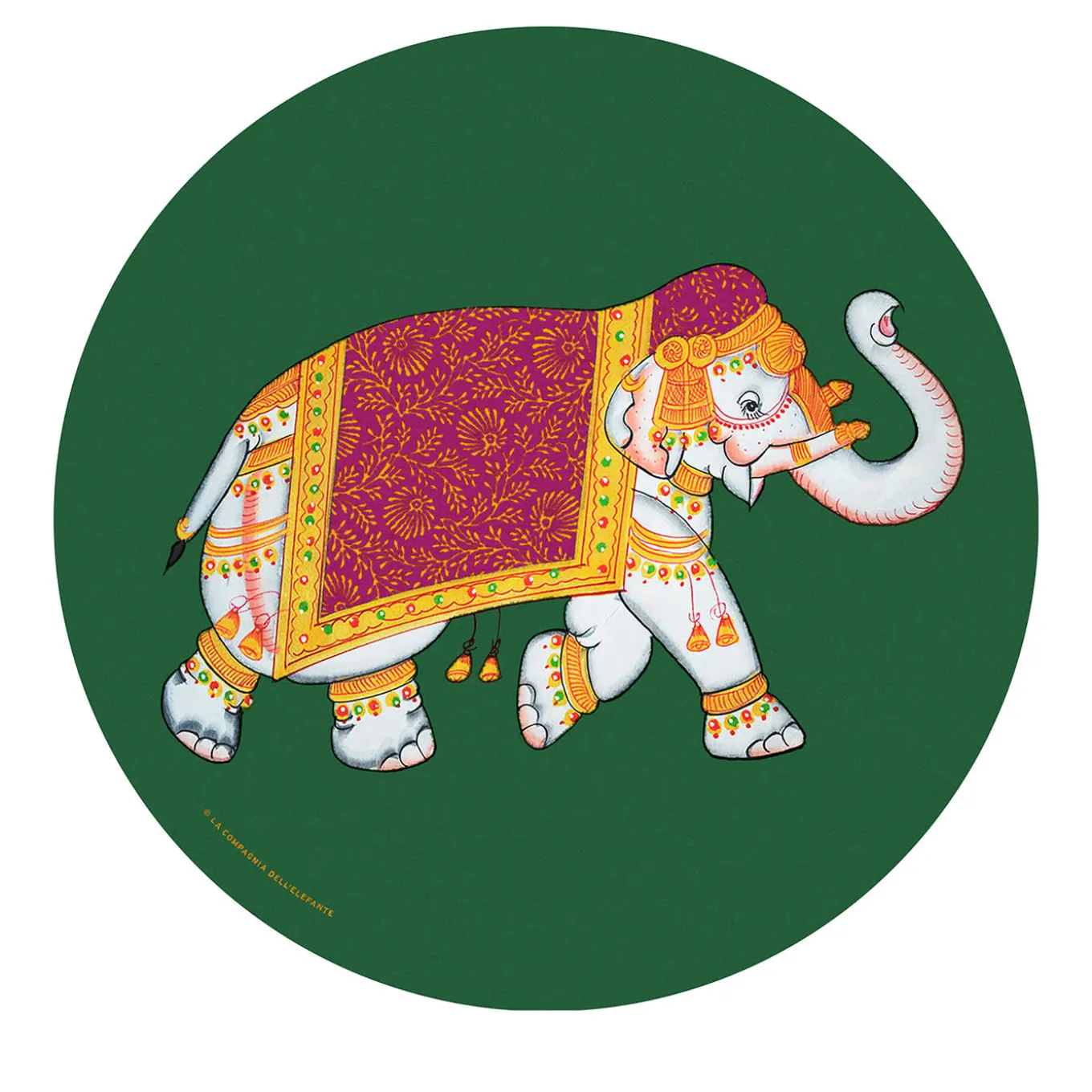 Hancrafted in Italy, this green round placemat is coated with cork and lacquered on the surface and is enriched with the design of an Indian white elephant, symbol of luck, fidelity and wisdom.