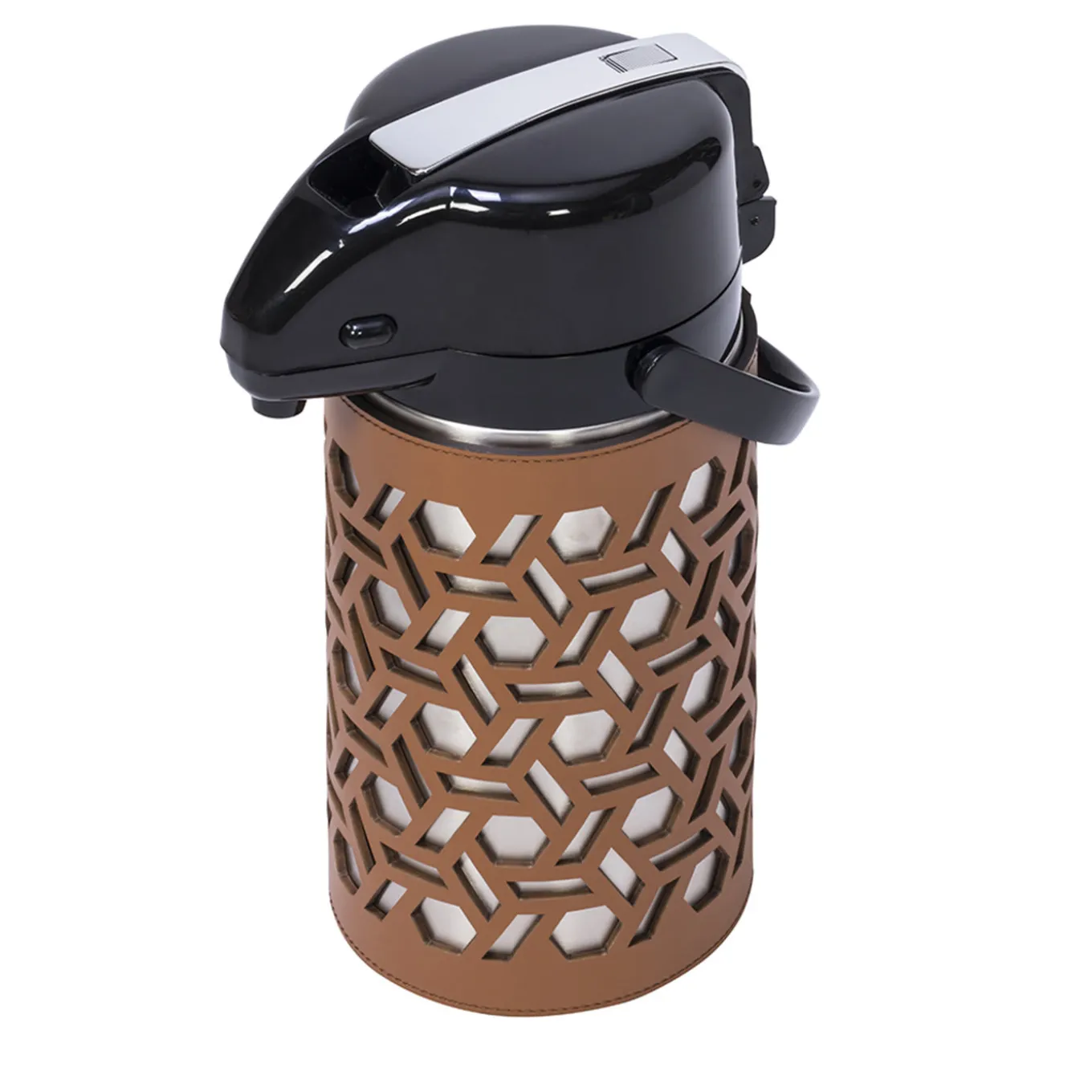 Ideal for hot and cold beverages, this insulated stainless steel airpot with Vienna pattern is covered in UV-resistant and water-resistant Finest Regenerated Leather and features a pour-through stopper and removable top. Made from black PP, with a chrome plated lever and a rotating base for multi-directional cup filling, it can maintain hot or cold temperatures for up to 24 hours.