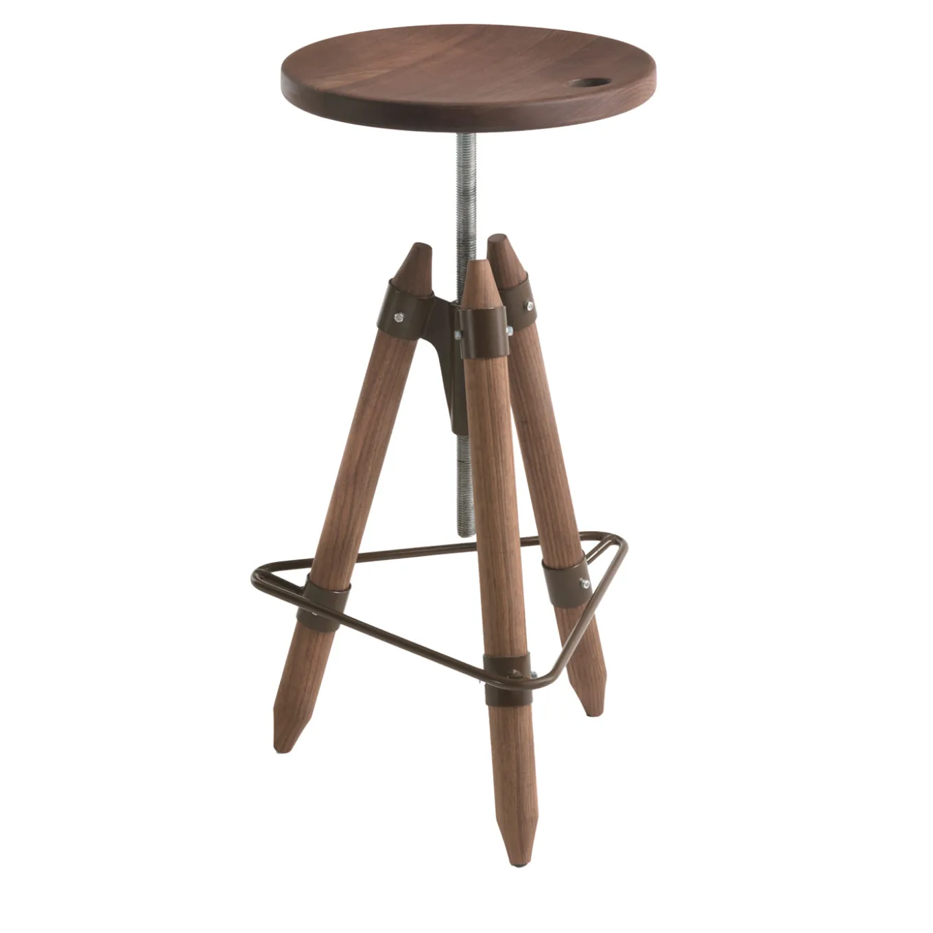 The Ello bar stool features a smooth, round seat that rotates and adjusts in height for personalized comfort. Crafted from knot-free walnut wood with an oiled finish, it combines natural elegance with durability. The triangular iron footrest provides sturdy support, complementing the robust wooden legs. Designed by Franco & Matteo Origoni, this medium-sized stool merges functionality with refined minimalist style.
