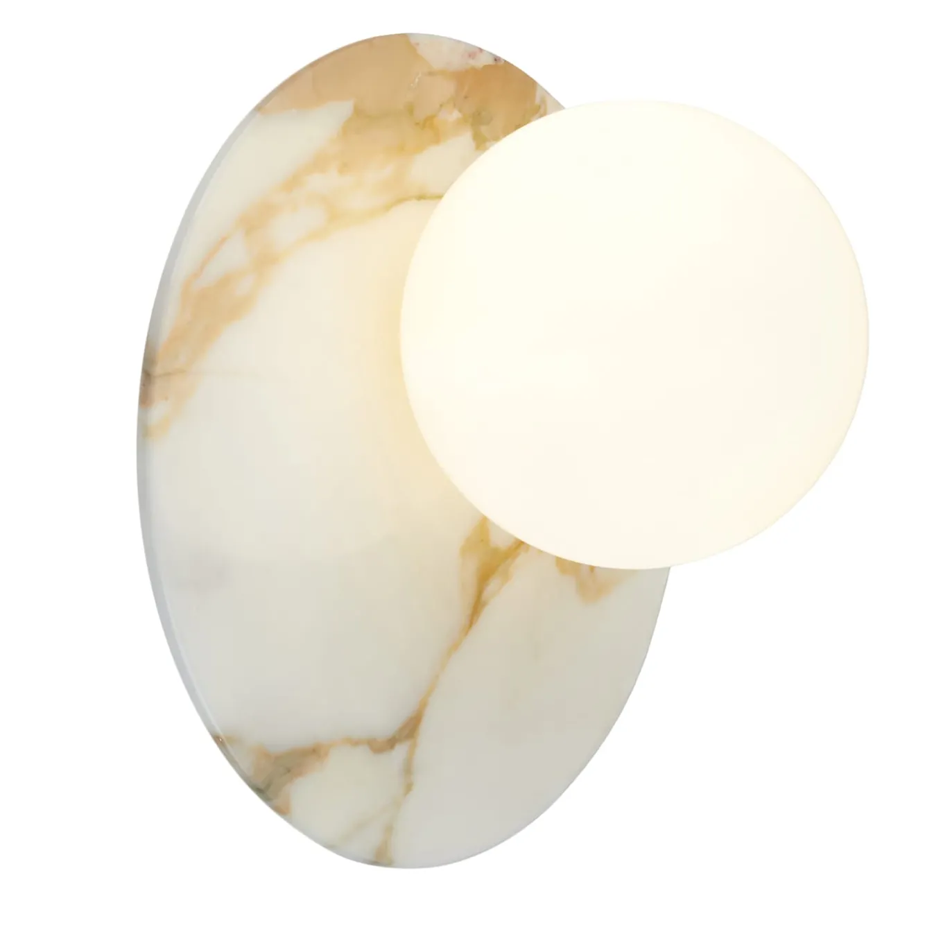 Unrepeatable traceries drawn by nature meet the purity of geometric shapes in this sublime sconce by Contardi Studio. A luminous opaline glass globe radiates its glow unobstructed while fitted to the disk-like element fashioned of prized white Calacatta marble. A green Guatemala variant suggesting assorted arrangements is also available in the Artemest catalog.