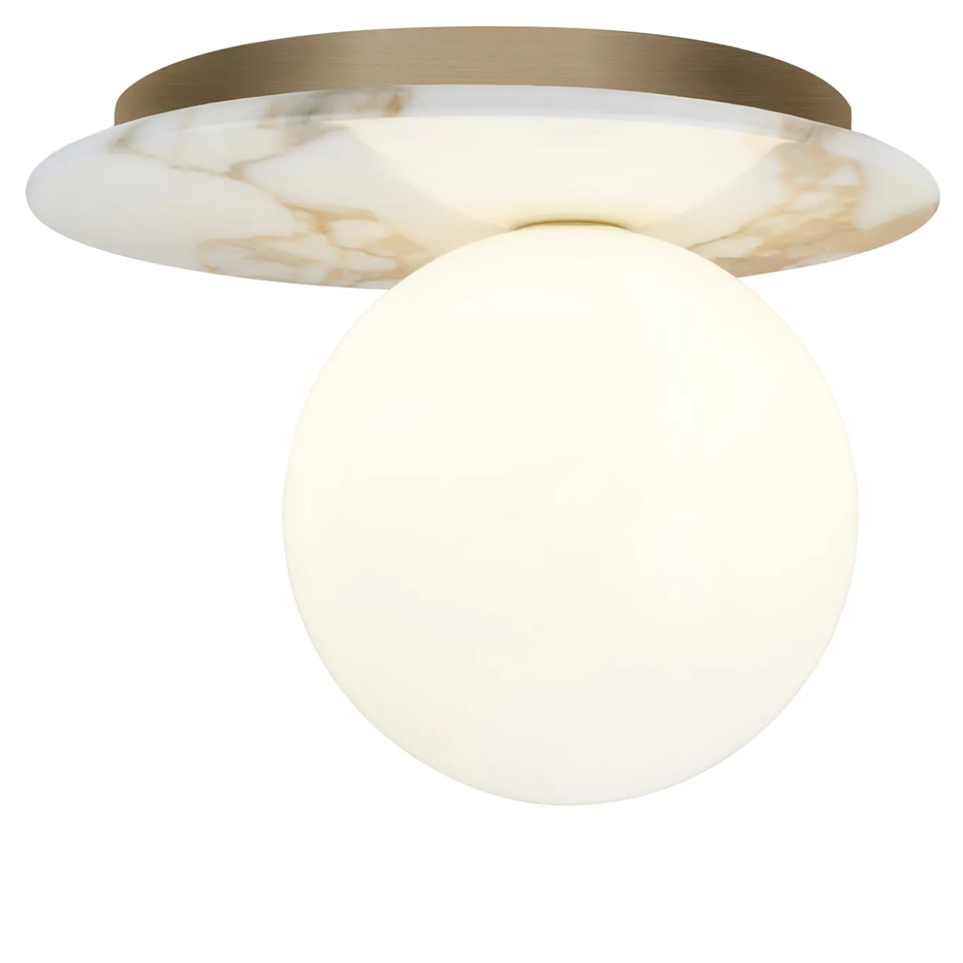 A refined and eye-catching lighting fixture to embellish a contemporary interior with lavish flair, this gorgeous ceiling lamp features a round white Calacatta marble body naturally enhanced by splendid golden veins and a spherical white opaline glass shade. Completed with metal details, it is also available in a green Guatemala version that can be found in the Artemest catalog.