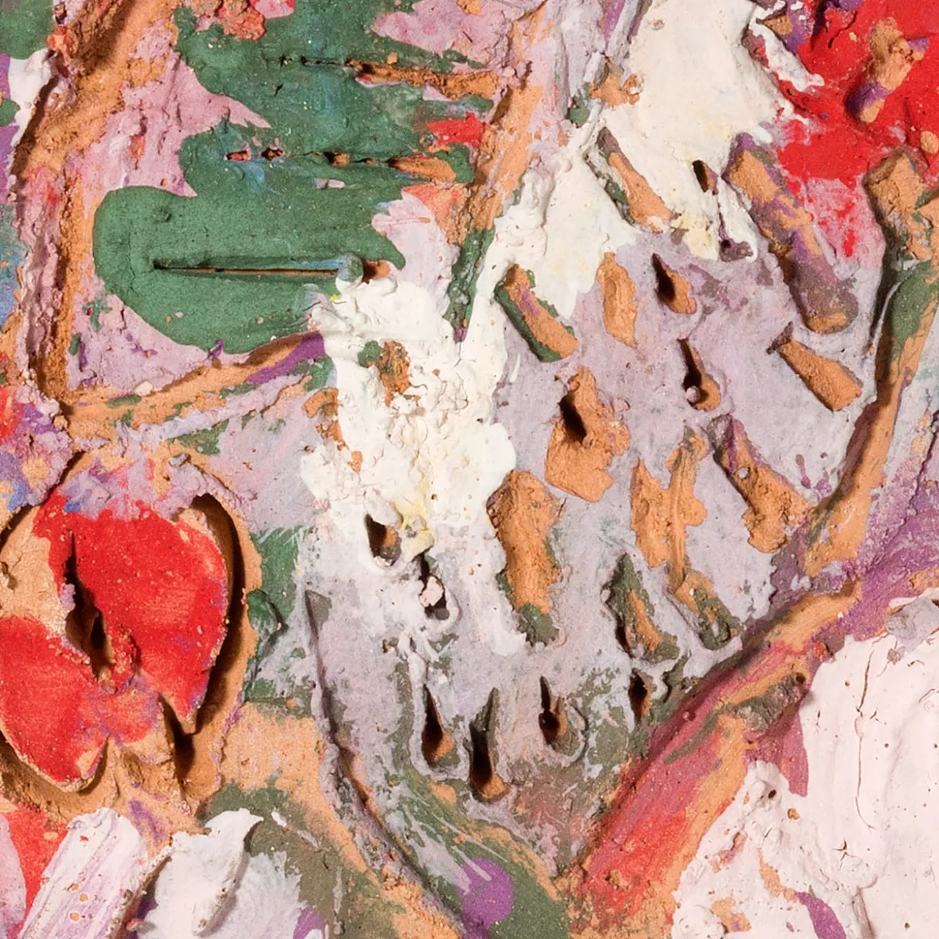 Titled “Emotions,” this rectangular clay tablet is painted in earthy tones of white, green, and red and adorned with incised holes that mimic the porous texture and scent of the earth. The piece evokes a sensory experience, connecting the viewer to the natural world.