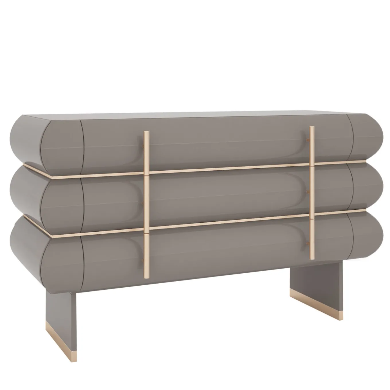 Stunning on its own or displayed together with its matching nightstand, this dresser exudes elegant modernity. Brass-finished metal details grace its dark grey-lacquered silhouette that is composed of three pillow-like layers hosting as many drawers. Their handles are made of dainty metal bars with a brass finish. This refined piece is available in several metal finishes and in different color and upholstery options, please contact the Concierge for details.
