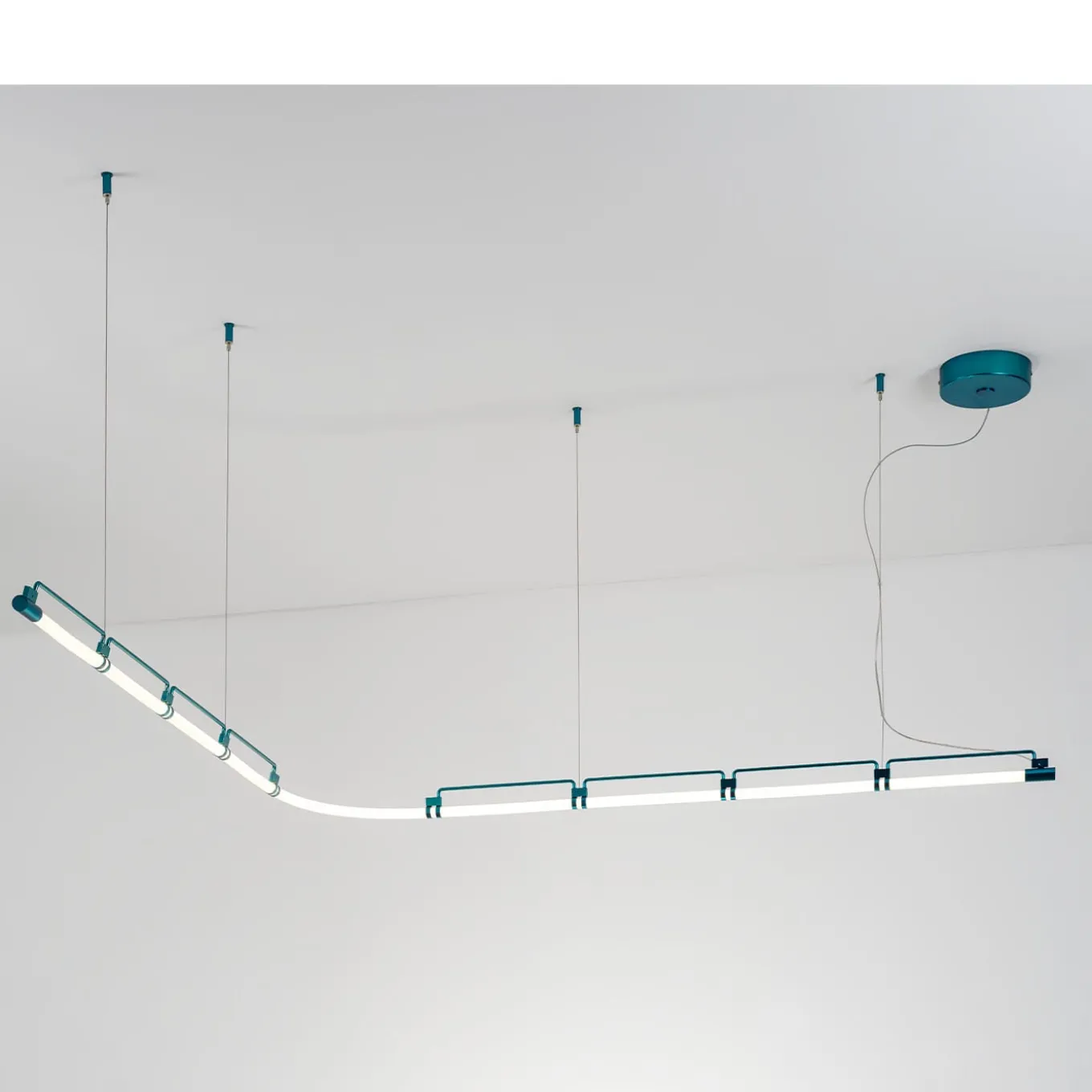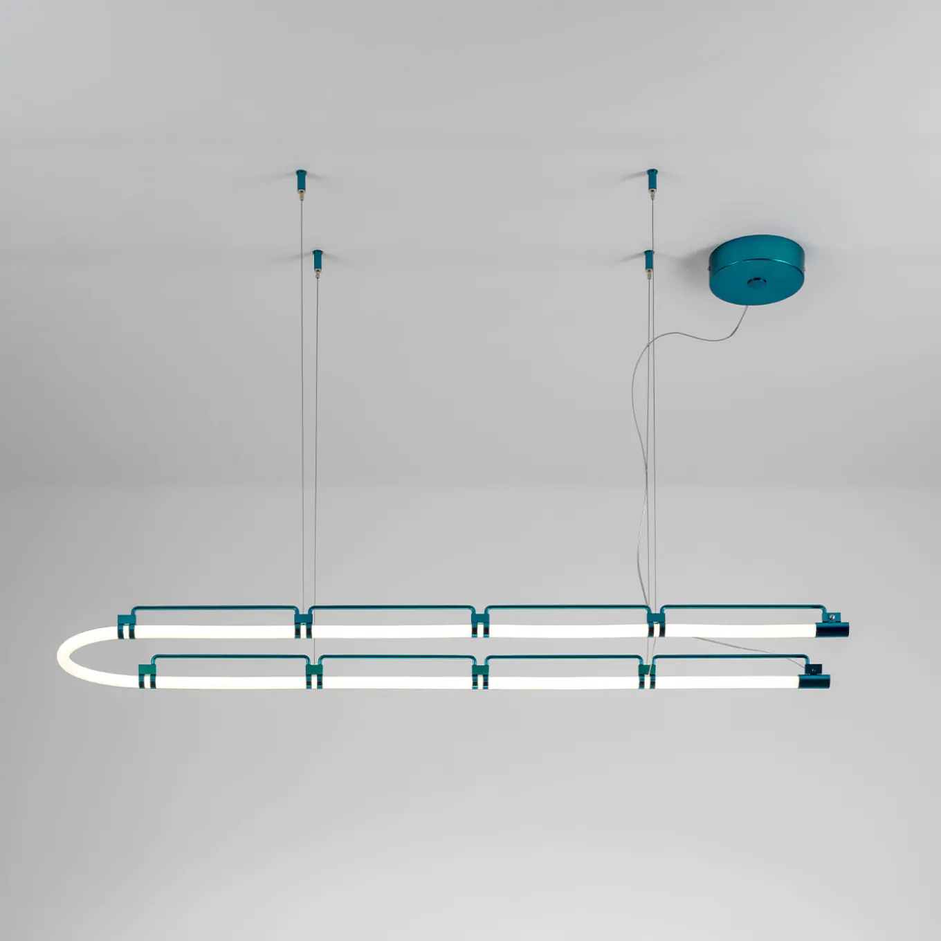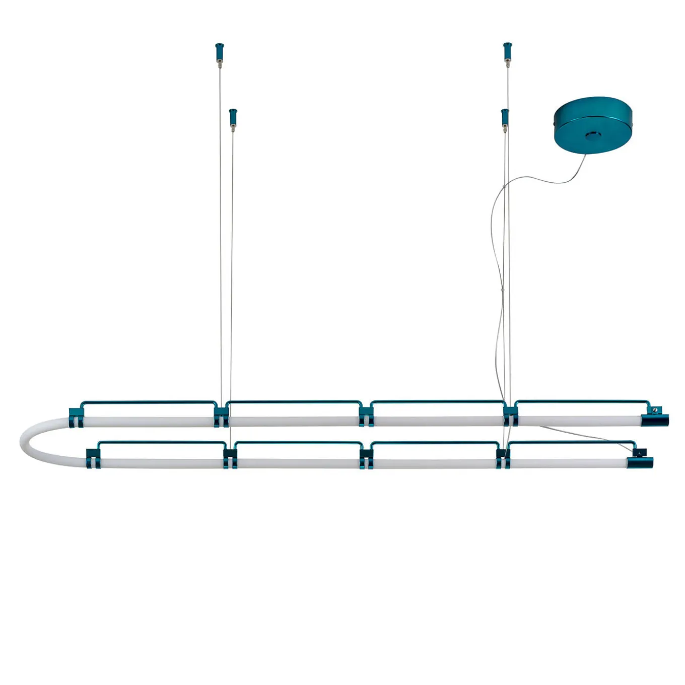 With its elongated dual-ring structure, this blue matte metal chandelier combines sleek geometry with advanced lighting functionality. Its adjustable orientation allows users to direct the light, while 3D LED technology ensures control over intensity and hue. Ideal for contemporary spaces, it brings a balance of aesthetics and innovation. As part of the Endless collection, it offers a sophisticated lighting solution that adapts to evolving design needs.