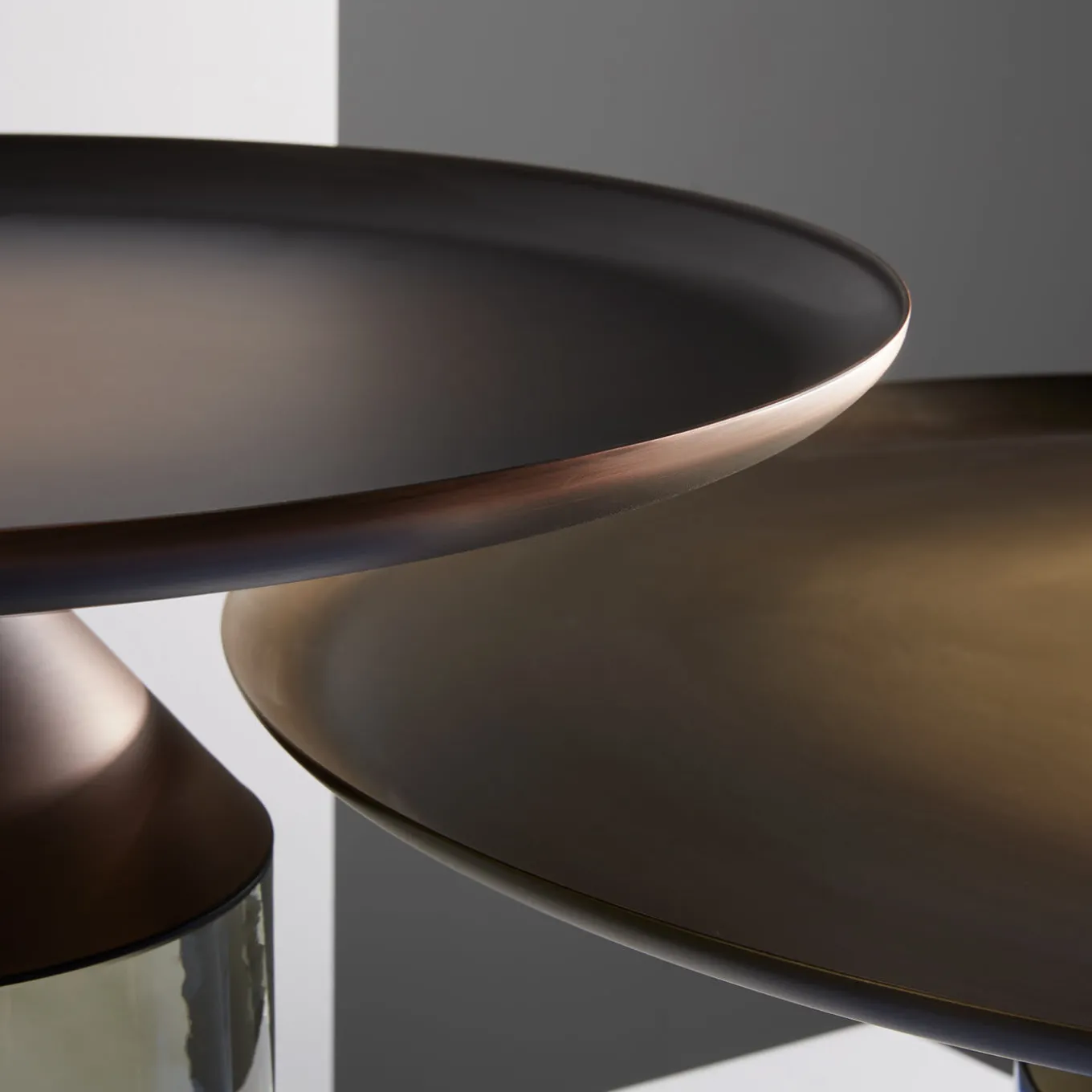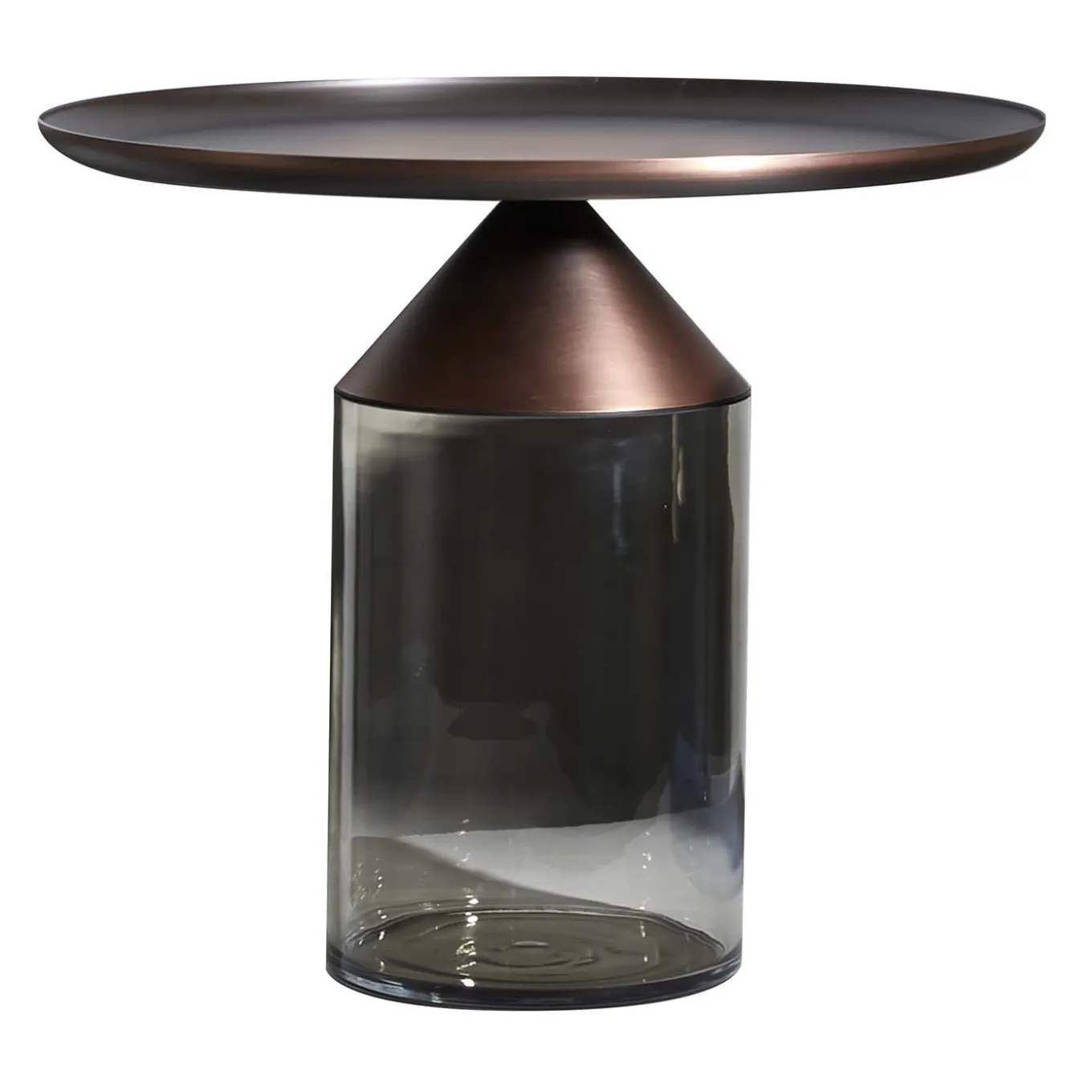 An interplay of balance and shapes, this exquisite coffee table features a smoke-gray toned glass base structure supporting a copper top whose deliberate flaws gives character. The top is also available with a delabré brass finish, the base can also be in blue glass. Perfect in a vintage or boho-chic living room, this piece measures: Ø 58.5 x H 50 cm.