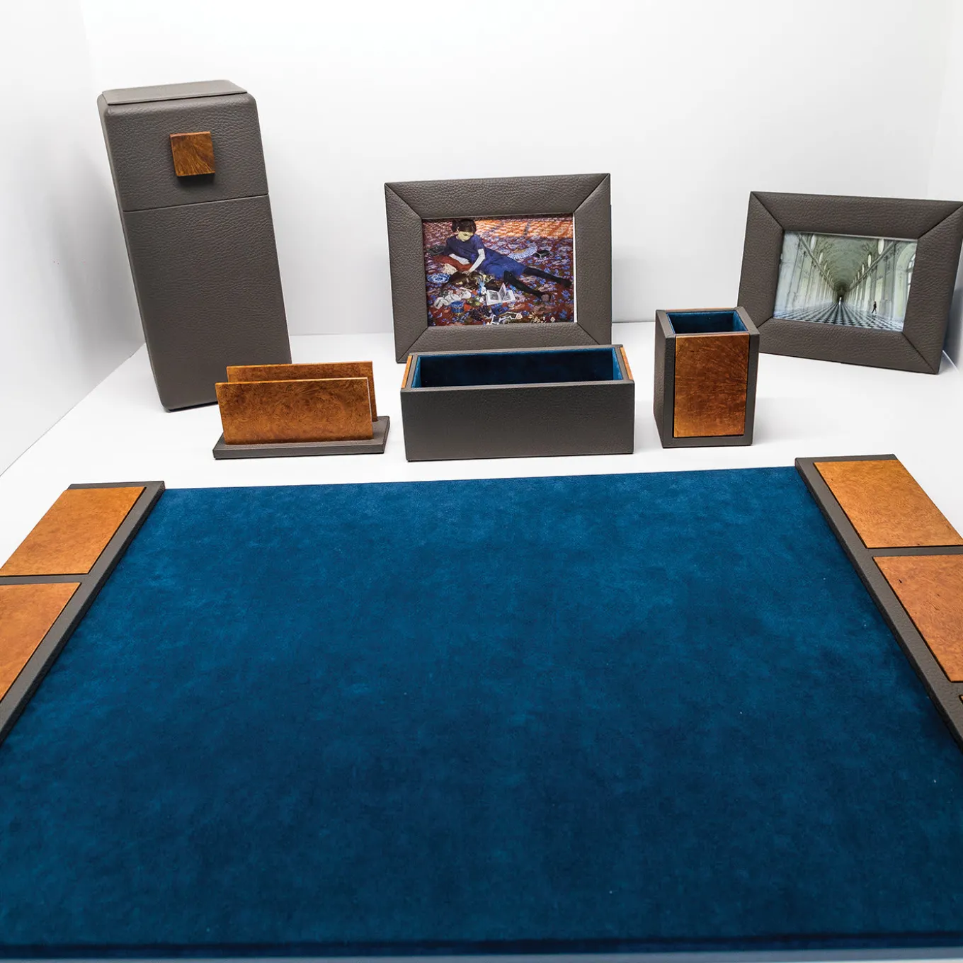 This rectangular writing pad is as elegant as it is practical and is sure to make a statement on any home or office desk. Entirely handcrafted, the wooden pad is lined with genuine Alcantara and flanked by panels in soft, full-grain leather and detailed with briarwood. Available in thirteen different colours.