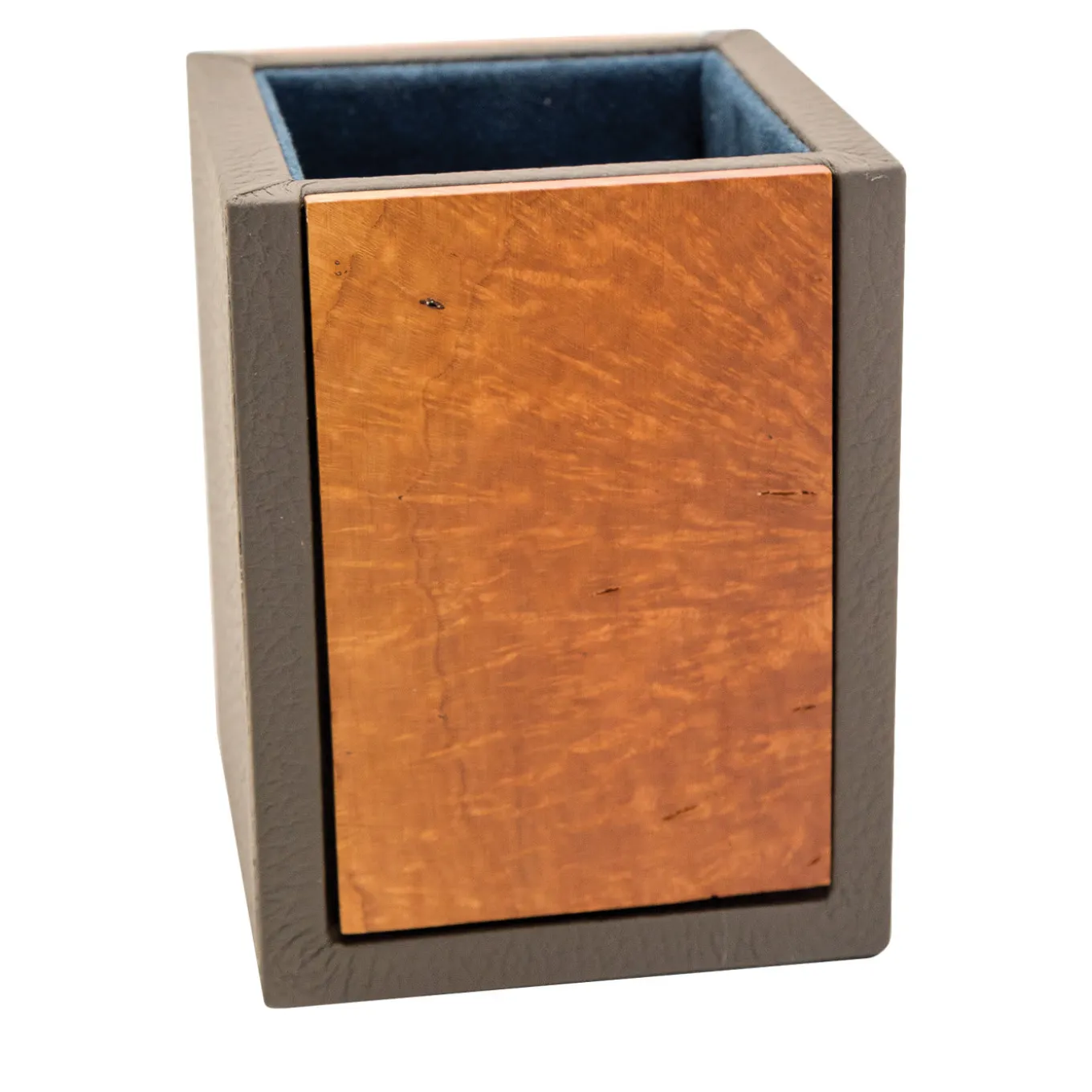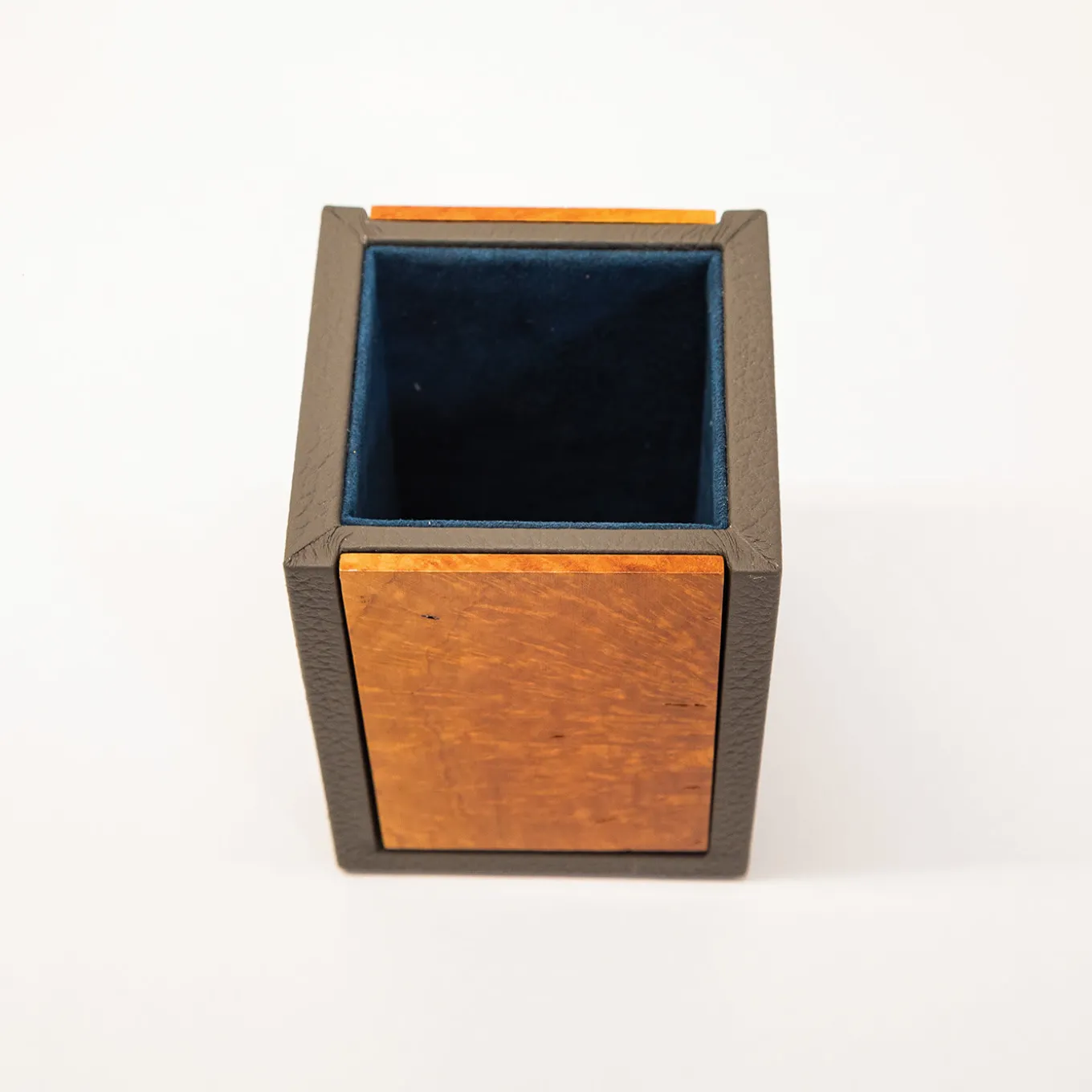 This rectangular wooden pencil holder is entirely handcrafted using soft, full-grain leather and completes its look with briarwood panels on the side. Lined with genuine Alcantara and available in thirteen different colours, this elegant but functional little piece is sure to catch the eye in any home or office space.