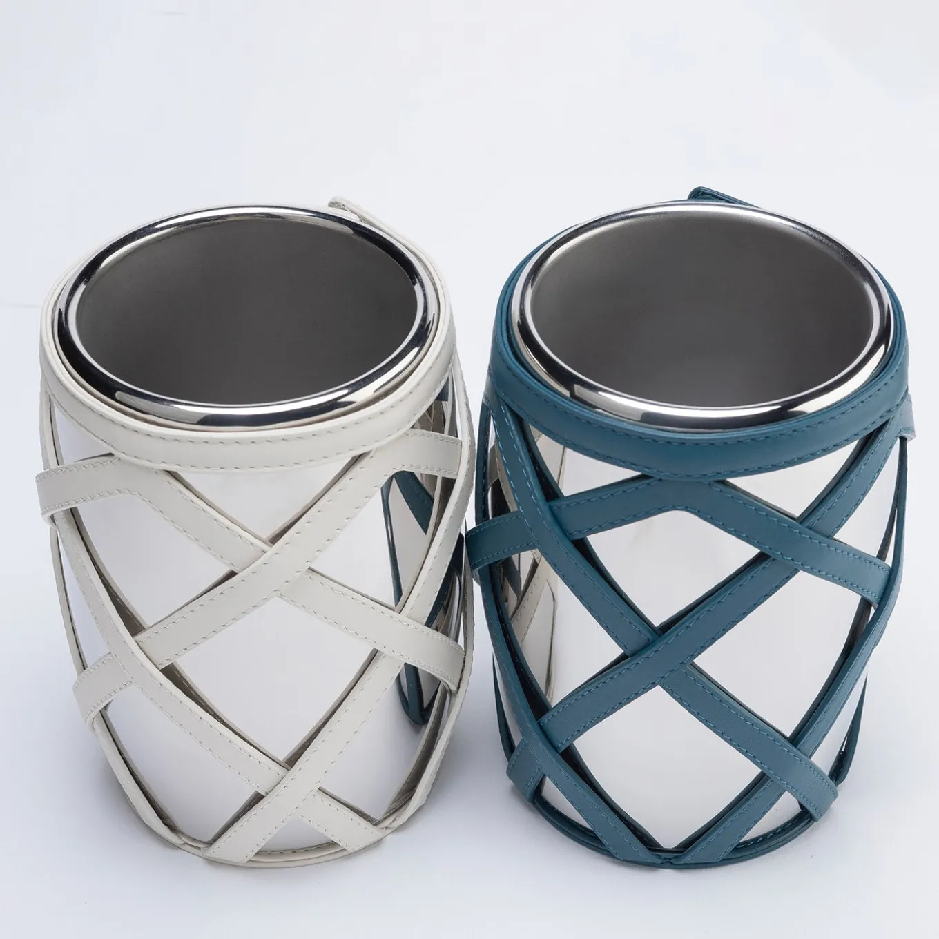 The insulated wine cooler from the Escher collection combines functionality with aesthetic sophistication. The interwoven leather bands alternate with the steel, creating rhomboidal geometries that add visual complexity and evoke the sense of mystery and depth characteristic of Escher’s works. Please, ask the Concierge service for further information.