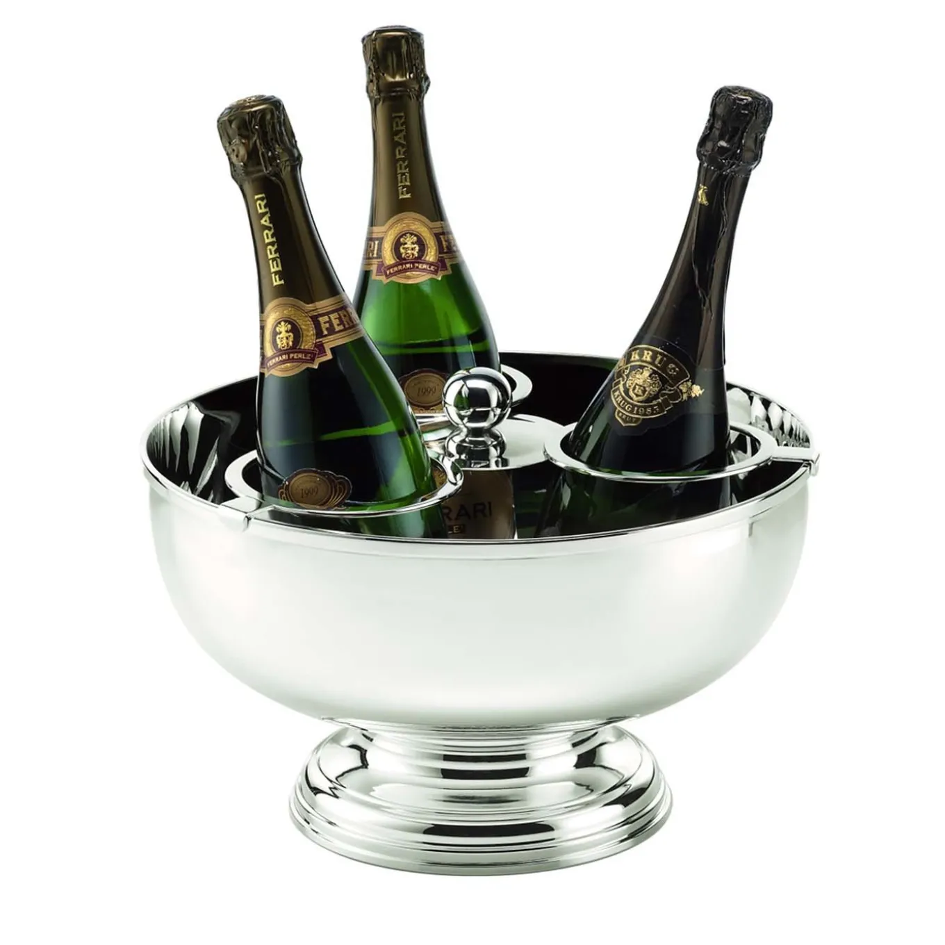 This superb silver-plated champagne bowl makes an elegant addition to a formal dinner or buffet table with its raised silhouette and generous size. Available also in solid silver or golden finish, this footed bowl can hold three bottles (35 cm diameter) securely in place thanks to a special removable support. Personalized engraving with monograms or coat of arms is available on request.