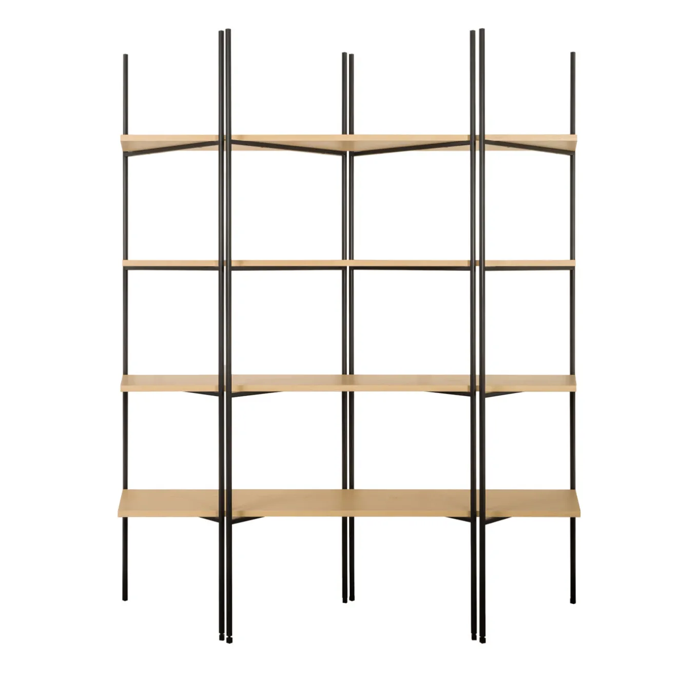 The Ethrio Collection is a modular system composed of steel & wood units that function as both flexible shelving and a room divider for an open-plan office or loft. The simple, linear structure is an intersection of green-varnished steel square tubes (15 x 15 mm) – set to form an ‘L’ shape – with four 20 mm-thick shelves of wood-veneered chipboard that create a visually light yet effective composition.