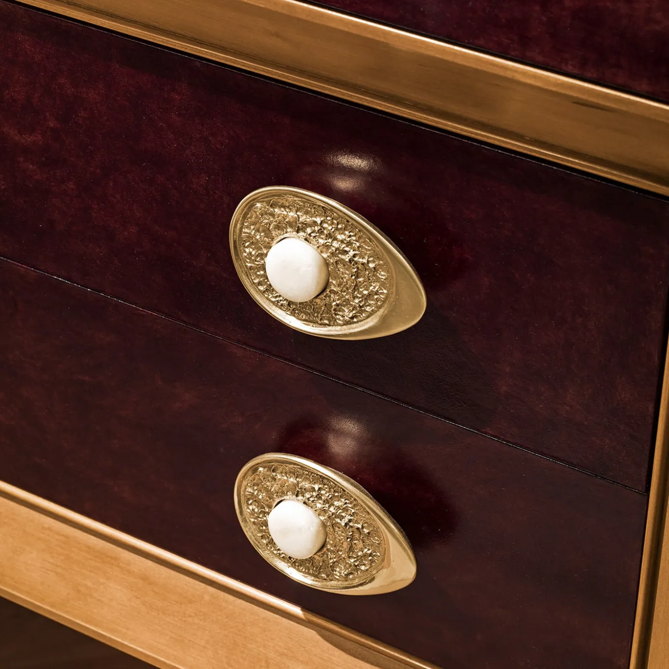 A sublime showcase of craftsmanship, this magnificent dresser is handmade of eucalyptus wood, enriched with parchment leather-upholstered details. Brass and mother-of-pearl handles adorn its two frontal drawers. A stately and iconic accent piece for a refined living room, it is ideally combined with the Eucalyptus bedside table for a cohesive ensemble.