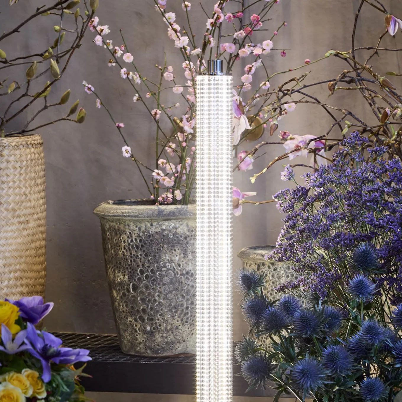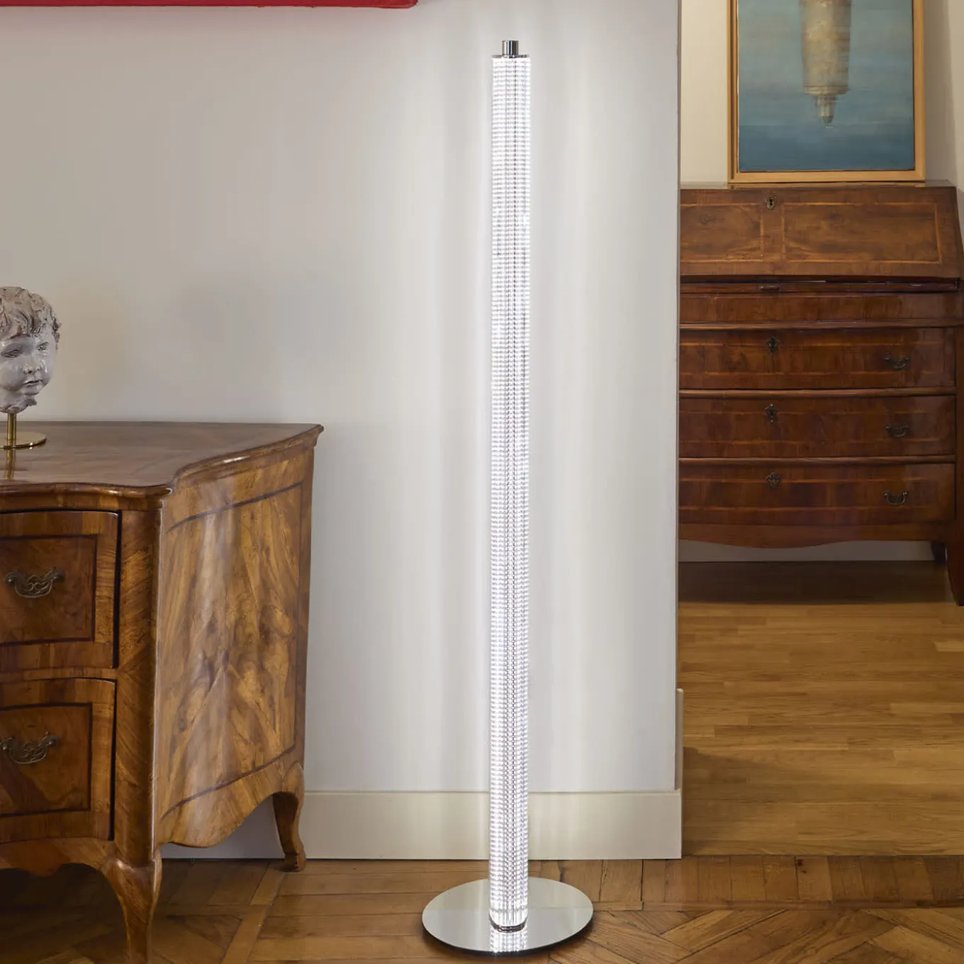 Sculptural and elegant, this floor lamp features LED strips emitting dimmable light hosted within a body of clear, extruded, and fluted glass that multiplies the reflections and indeed tempers its impact. Please contact the Concierge for the sandblasted glass version allowing for an even more suffused output.