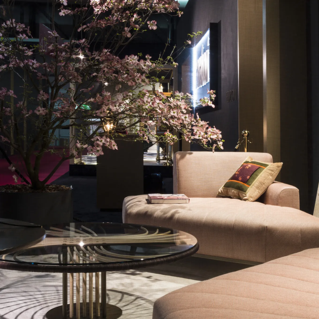 This chaise longue is a modular piece that will perfectly suit a precious corner of a modern living room. Exuding impeccable comfort, it boasts a curved and welcoming silhouette upholstered in fine pink fabric for a soft and unconventional touch. Please inquire with the Concierge for details on the materials.