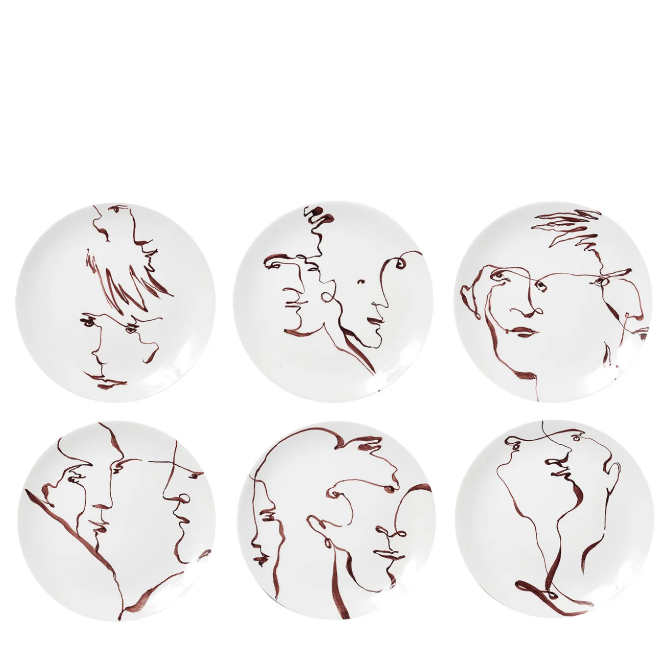 In this collection, the graphic space of the plate is only a passing point: the lines that trace the faces, created in a game of never lifting the brush from the support, extend beyond the edges in an enigmatic dialogue between details of eyes, mouths, and profiles – leaving their thoughts and conversations to the imagination.
