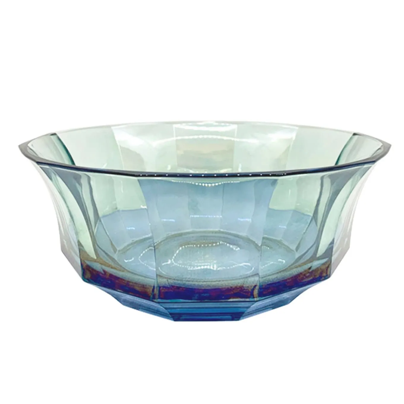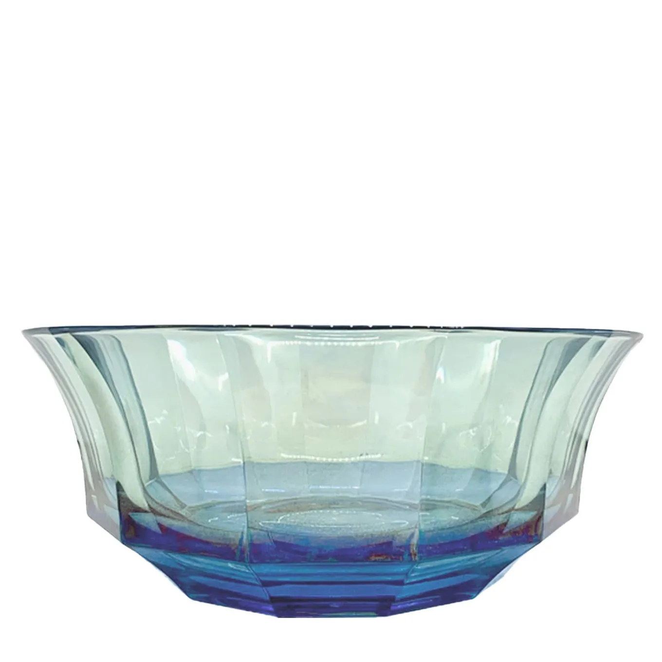 A fresh coloring fading from blue into light green characterizes this superb crystal salad bowl, which flaunts a stupefying iridescent gleam. Marked by an intensely faceted design and silhouette flaring upwards, it recalls a flower blooming under the caress of sunlight. Other color variants are available in the Artemest catalog. Please wash by hand only.