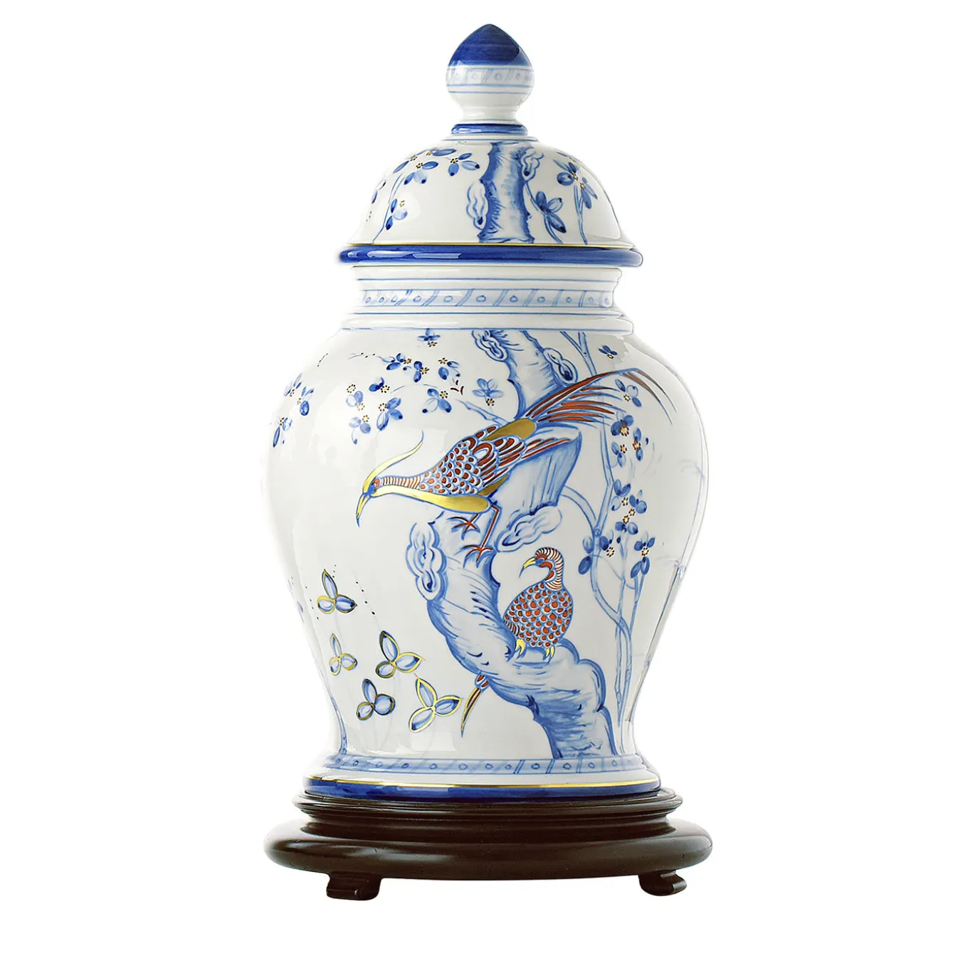 A singular design highlighting the innate, luminous charm of white porcelain distinguishes this exquisite potiche. Dainty blue decorations are the background for the eye-catching adornment depicting two graceful pheasants after which the whole collection is named. Equipped with a dome lid enlivened by a flattened finial, this exclusive piece rests on a footed, tiered base.