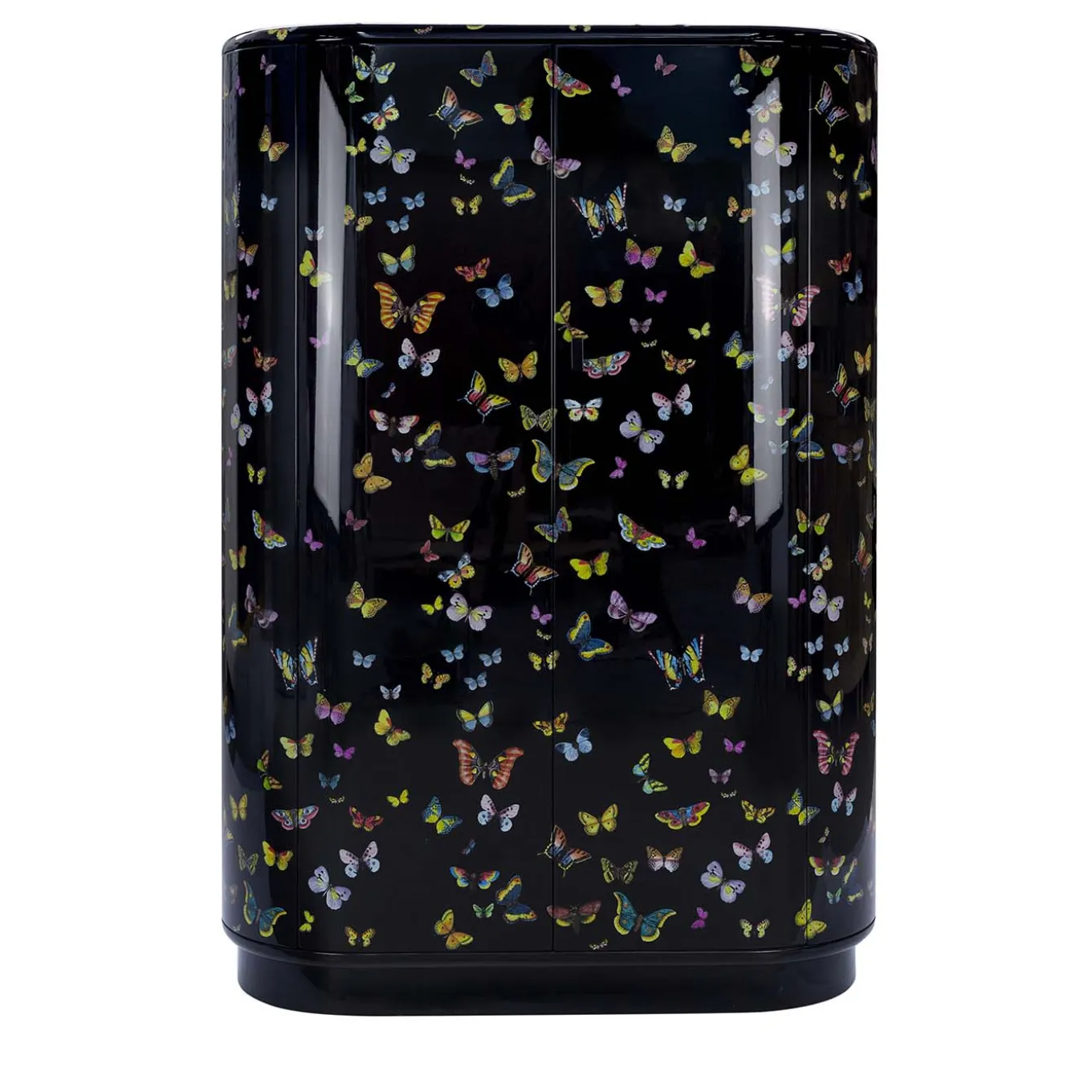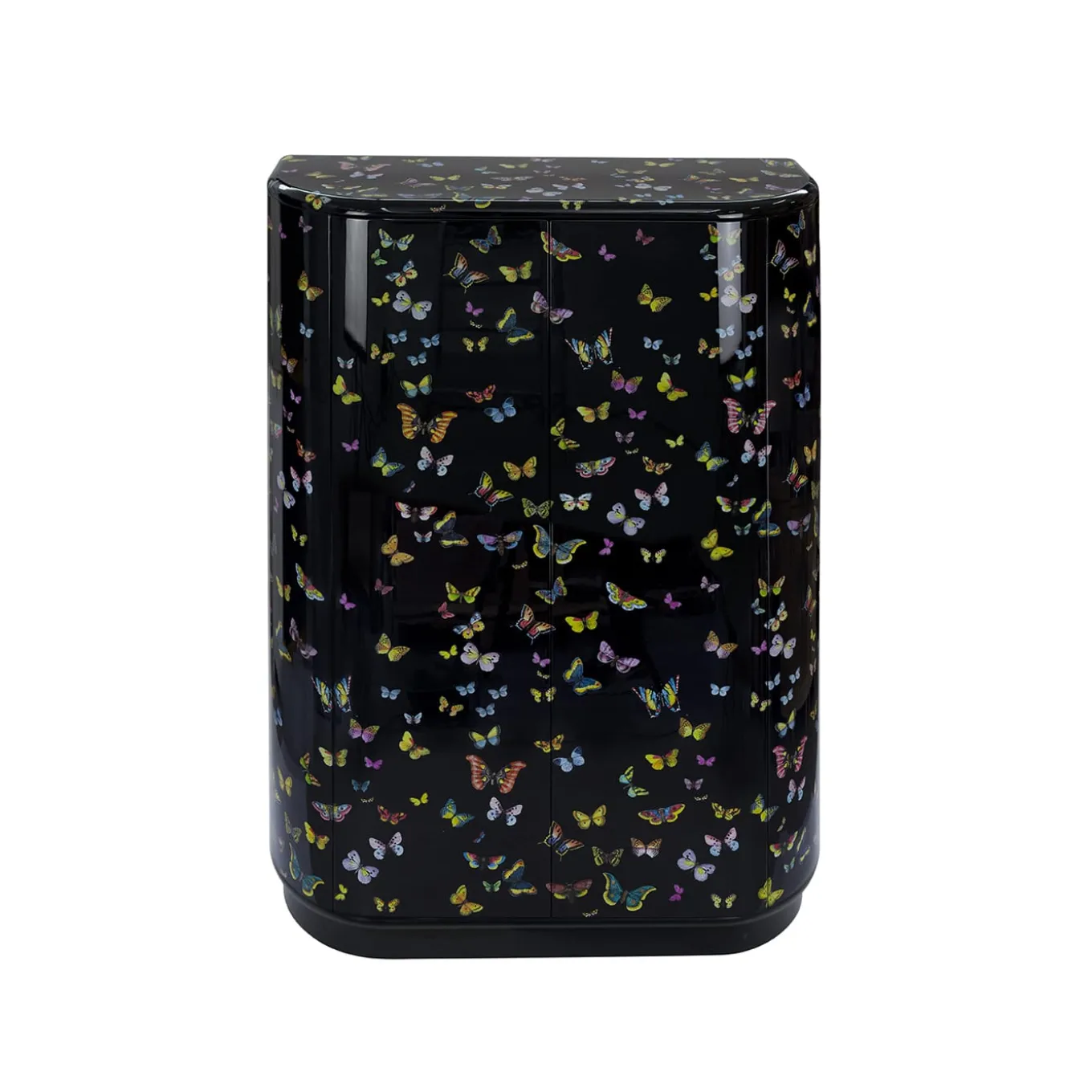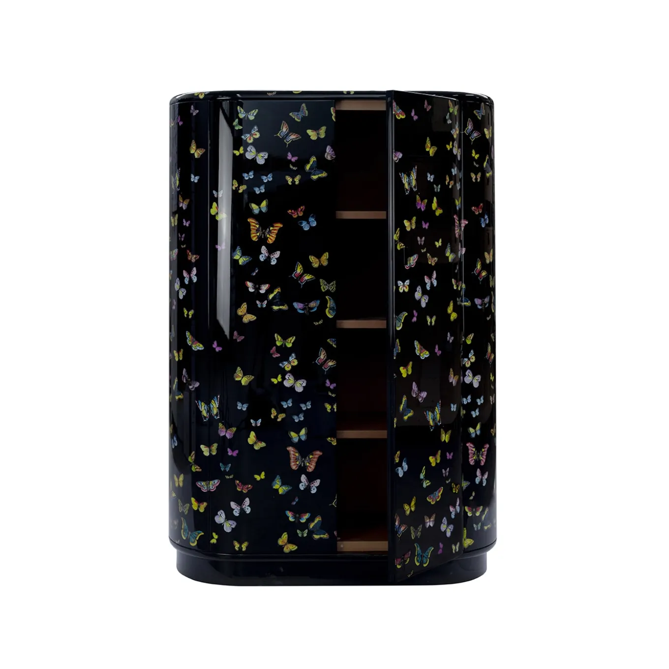 The Fornasetti curved cabinet is a wooden storage piece of furniture silkscreened, painted and lacquered by hand following the Atelier’s traditional method. The motif features Fornasetti’s iconic and colored butterflies on an elegant black background. Each Fornasetti wooden piece of furniture is a unique piece and any minor discrepancies between similar creations are the result of craftsmanship.