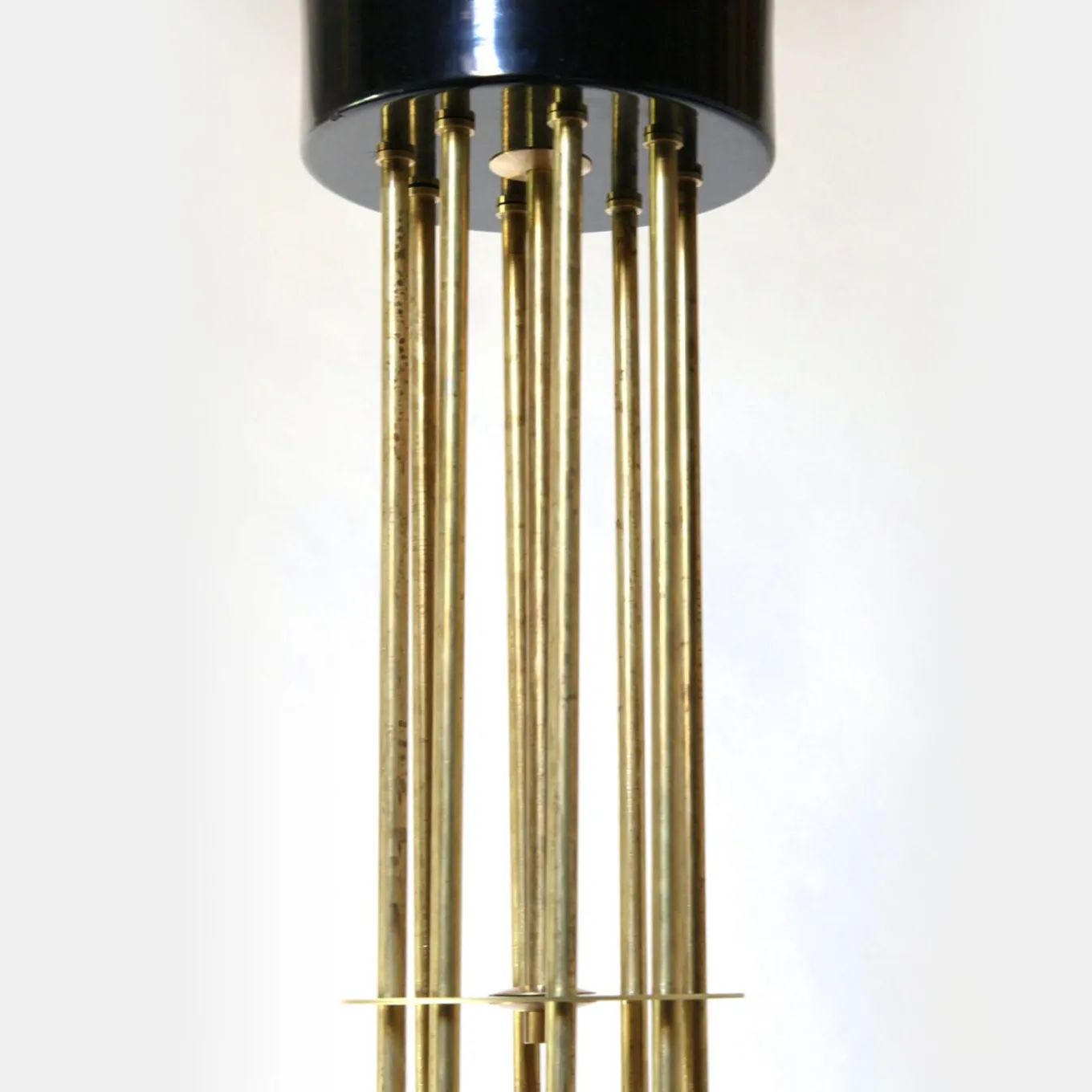 A project that arose during a dinner between friends, this chandelier by renowned designer Carlo Nason was conceived as a bundle of stems, each able to rotate for customized light effects. The branched brass structure is equipped with a ring keeping the upraising arms parallel, each culminating with a conical black-painted aluminum shade. It fits eight E14/E12 lightbulbs. Explore customizations with the Concierge.