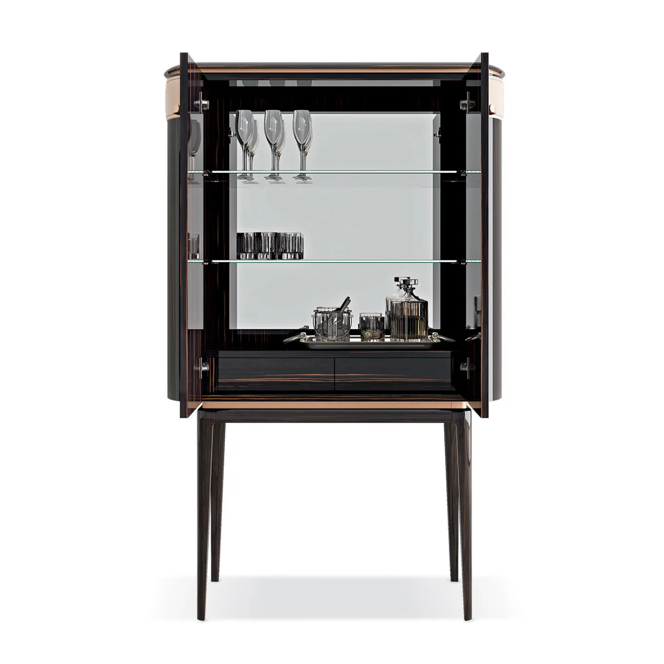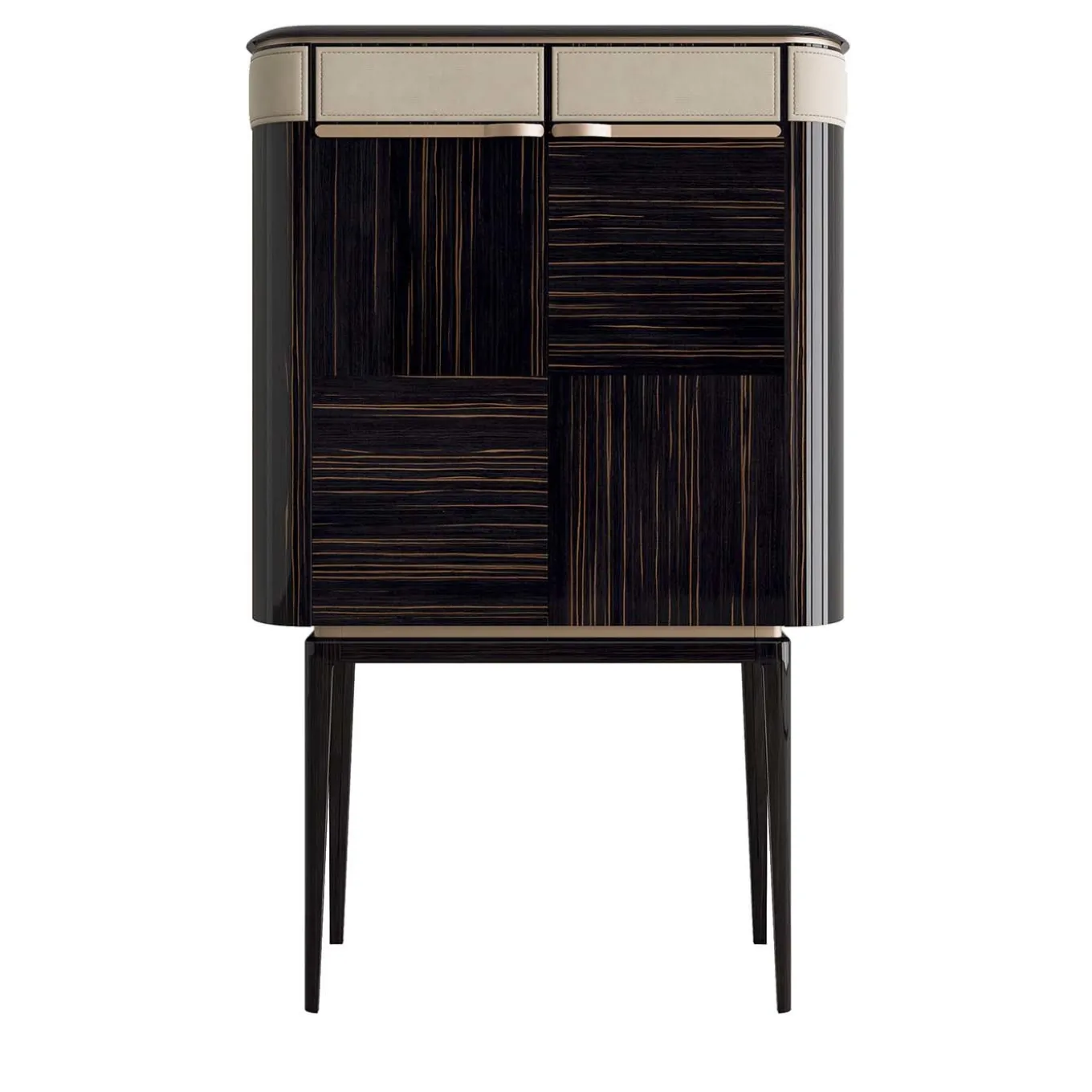 A striking combinations of finishes create a sophisticated bar cabinet that will be a stunning decorative accent in a living room, while also providing precious storage space for drinks and glasses. The wooden base with tapered legs has a glossy finish and supports a structure with ebony veneer (also available in rosewood or grey eucalyptus). The door boasts steel handles with a gold finish (also available in rose gold or champagne) and a top insert in beige leather. The top features the same veneer of the rest of the piece, but can also be in marble, please ask the Concierge.