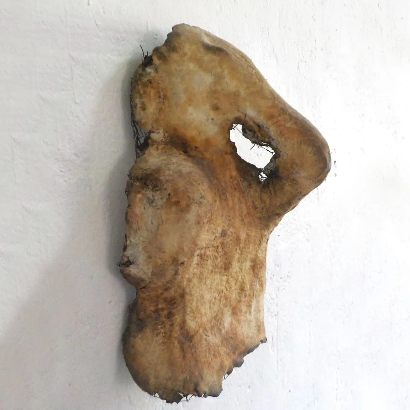 This sculptural work stem from the need to make approach to the human figure three-dimensional. This exploration of the human body began with cut-out shapes in iron or tar, which were then printed on paper, evolving into three-dimensional sculptures in ceramic, using raku firing, or made with synthetic resins and marble powder. This piece, crafted with synthetic resins and later painted with marble powder and pigments, depicts a figure with a hand resting on its head.