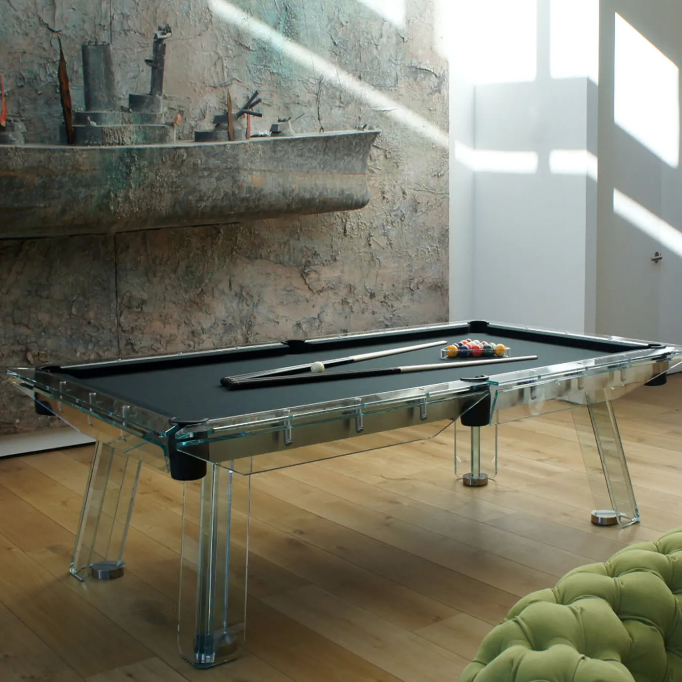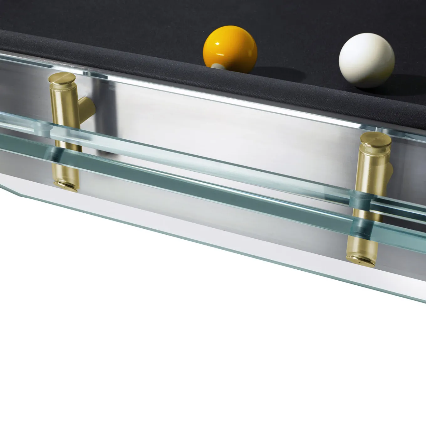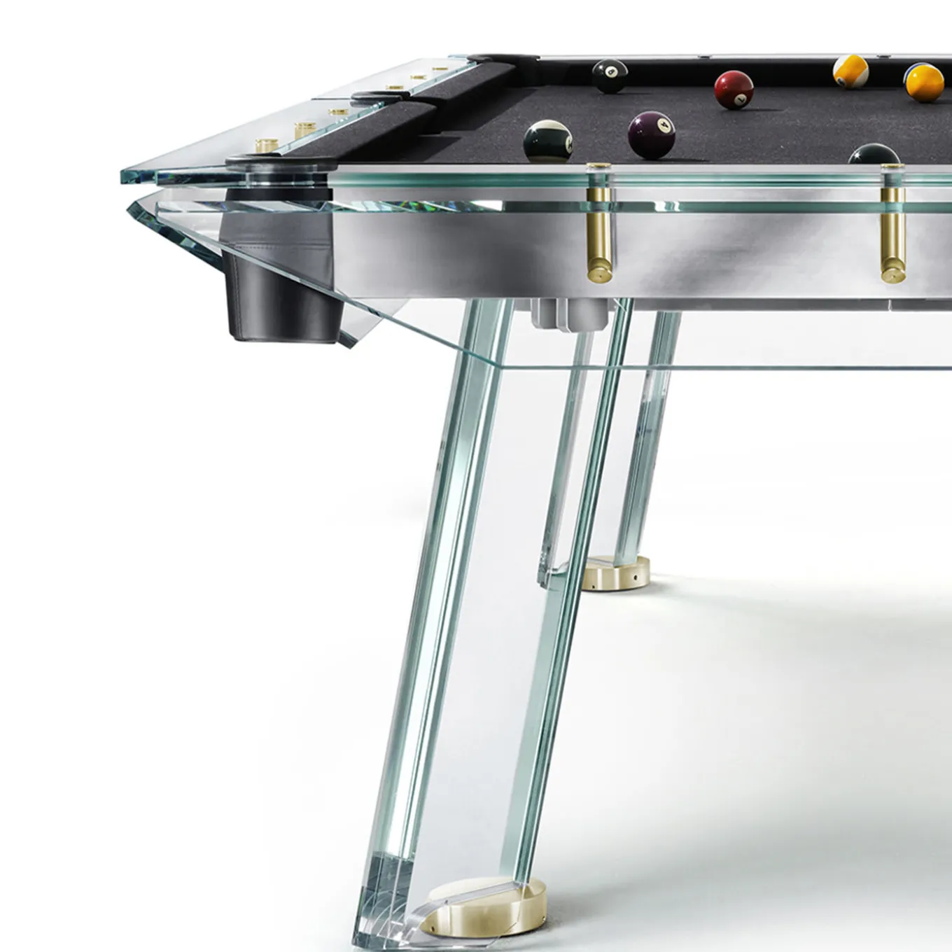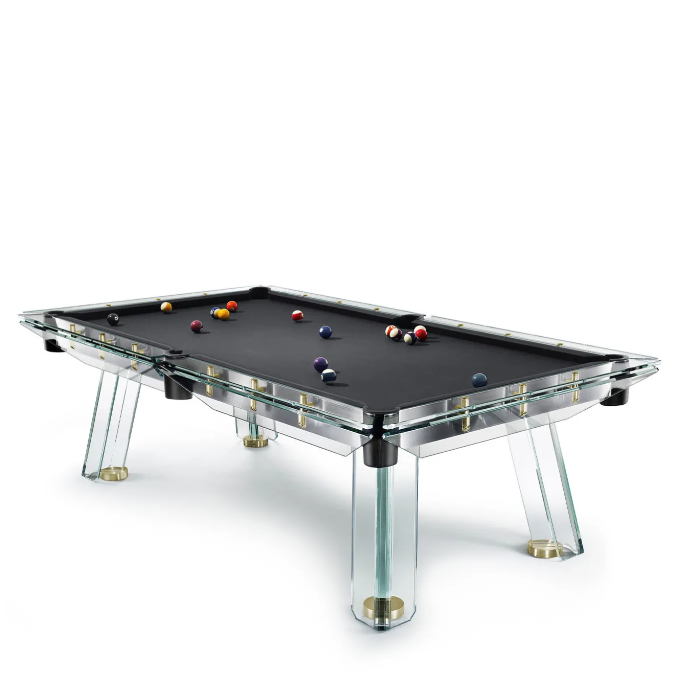 Filotto is the classic game of billiards, an emblem of leisure originating from the palaces of the bourgeois, which has since become a popular sport across the generations. The magic of the table lies within the realized thin steel frame, which is both adjustable, divisible and supports the solid slate game surface, as well as the crystal structure that characterizes the new design. The exclusive 24k gold details further enhance the preciousness and originality of this piece. The unique feeling of seeing the billiard table “float” on four legs is complementary to the pleasure of playing on this Italian masterpiece. 1 Professional cue ball set and 4 Cue sticks included.