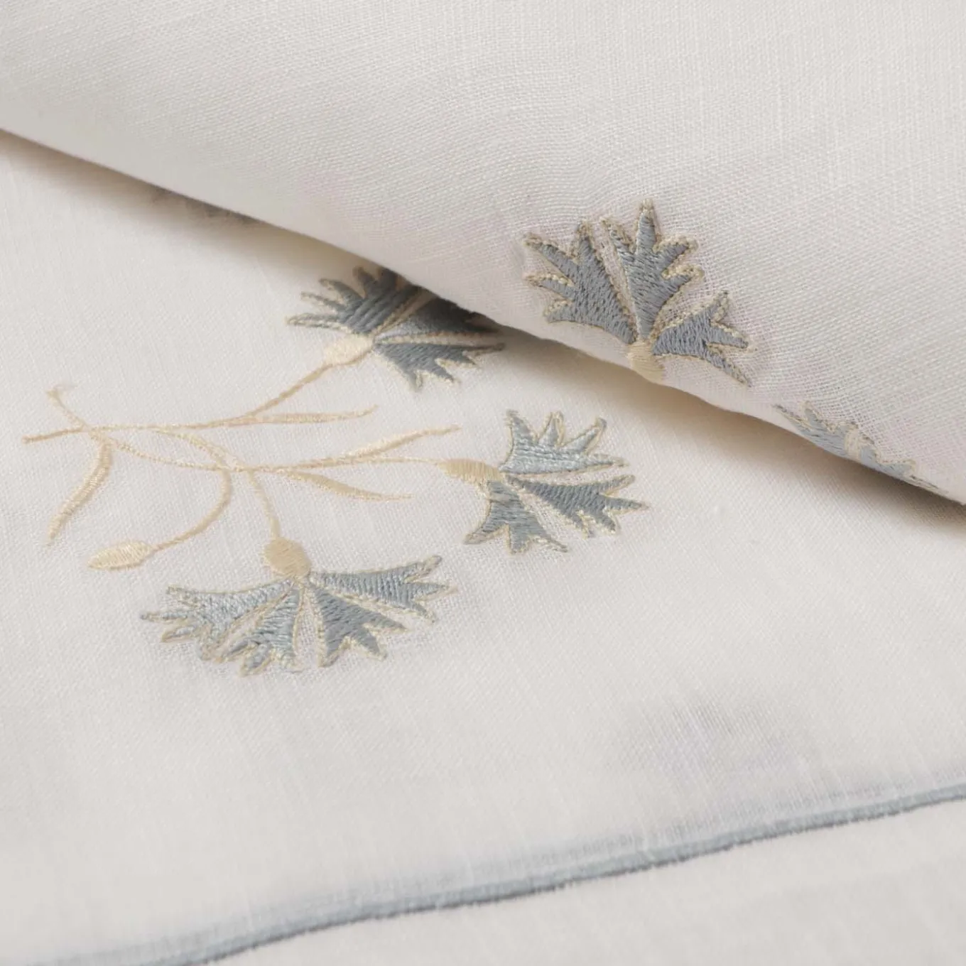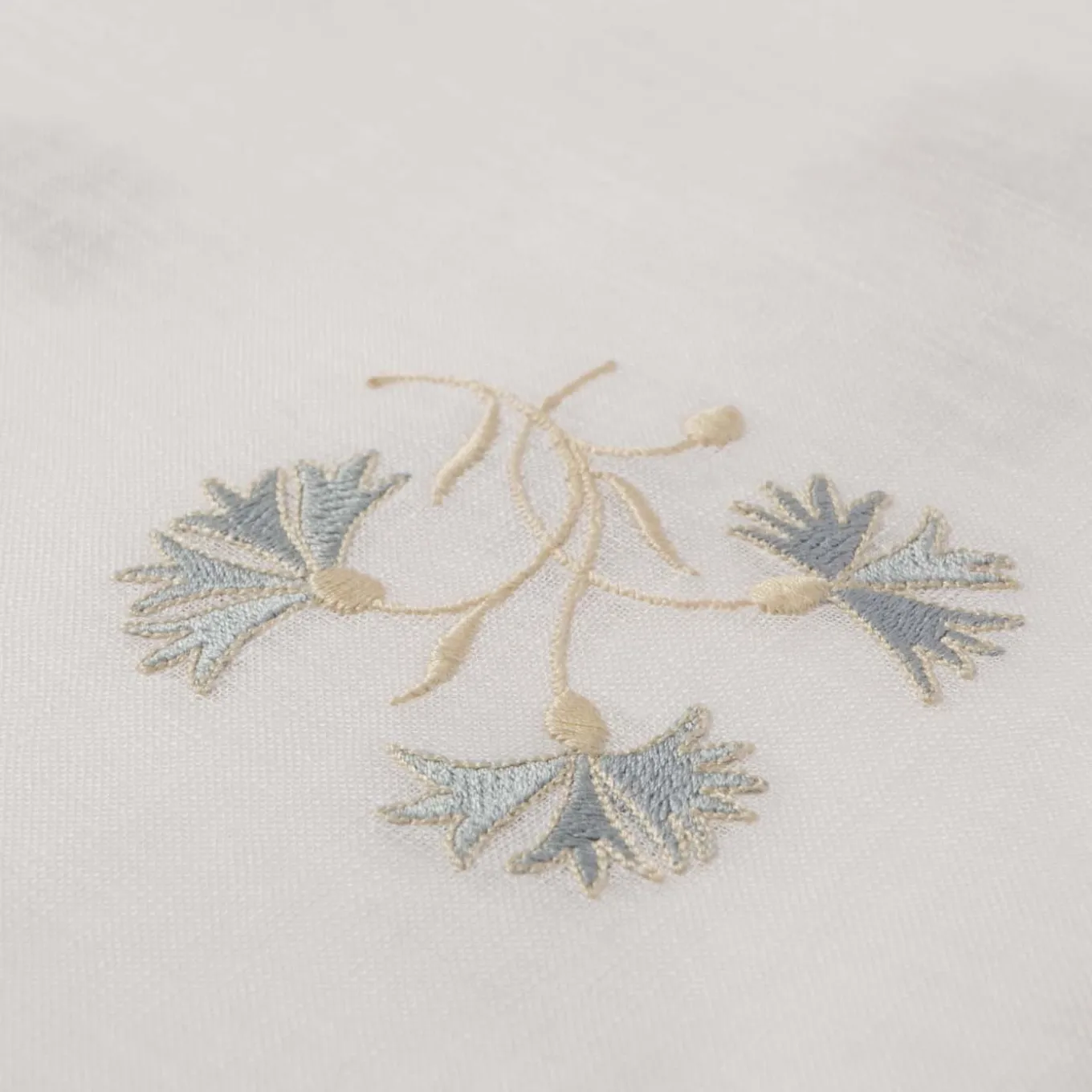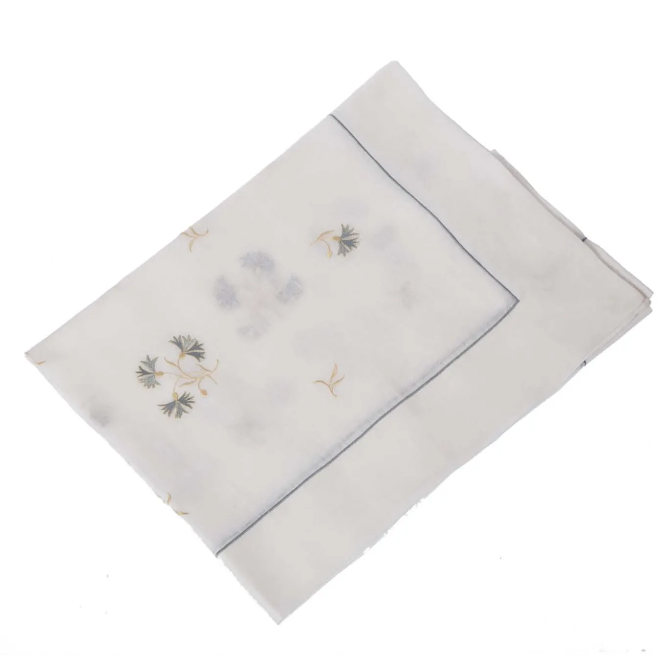 This elegant tablecloth has the romantic style of vintage embroidery, with its delicate floral motifs that are exquisitely rendered with intricate chain-stitching and repeated throughout the entire surface. Each motif is composed of three fleur-de-lis with gold accents, and the light blue color is repeated along the border in a simple linear detail. A truly stunning accent to dress any table in your home. Available in many sizes, please ask the concierge for details and pricing.