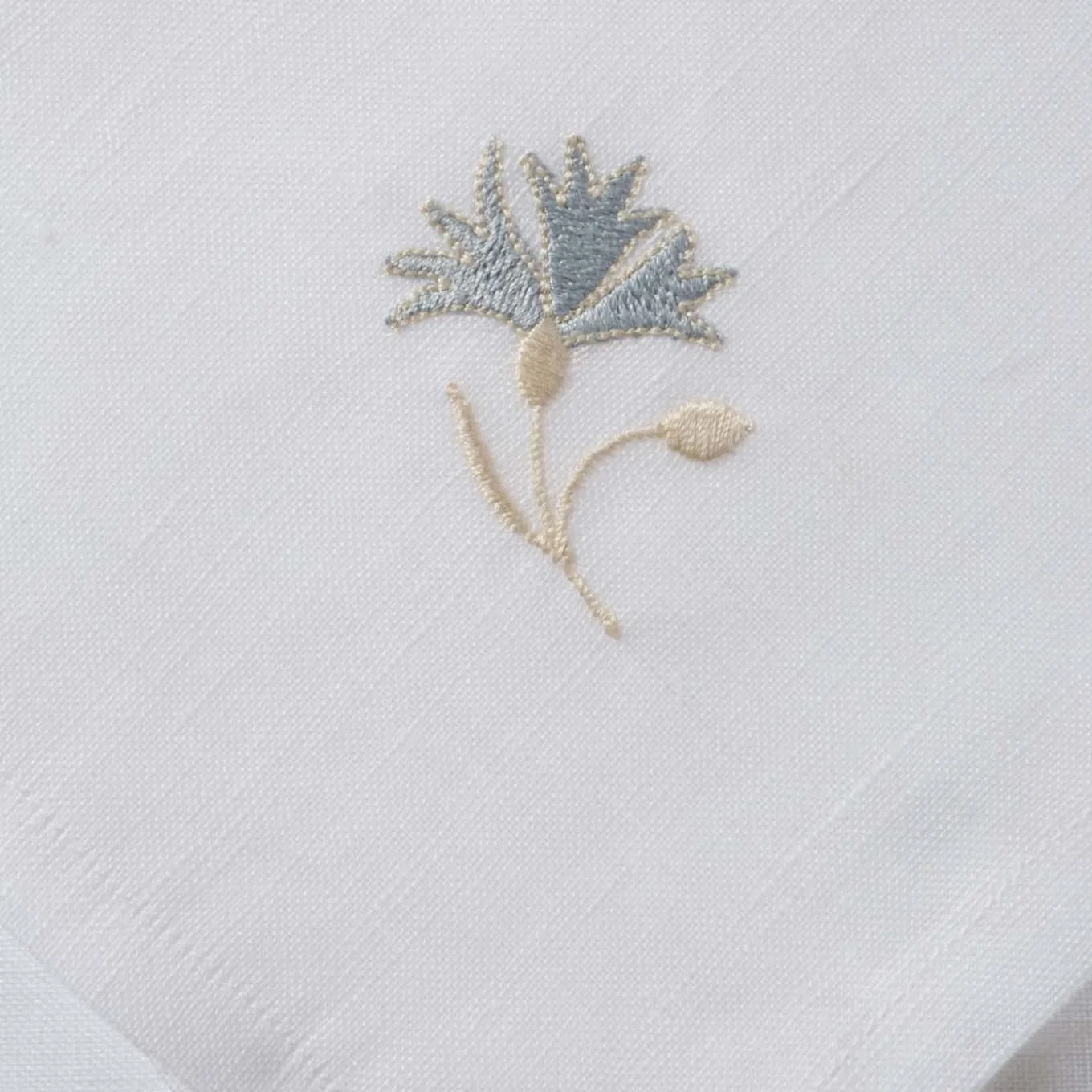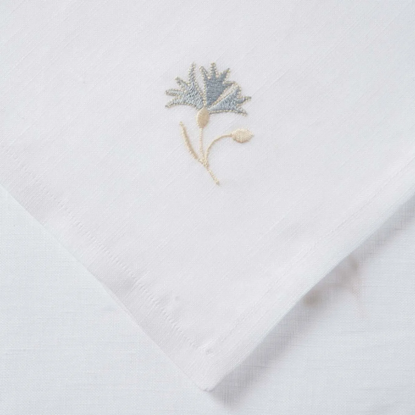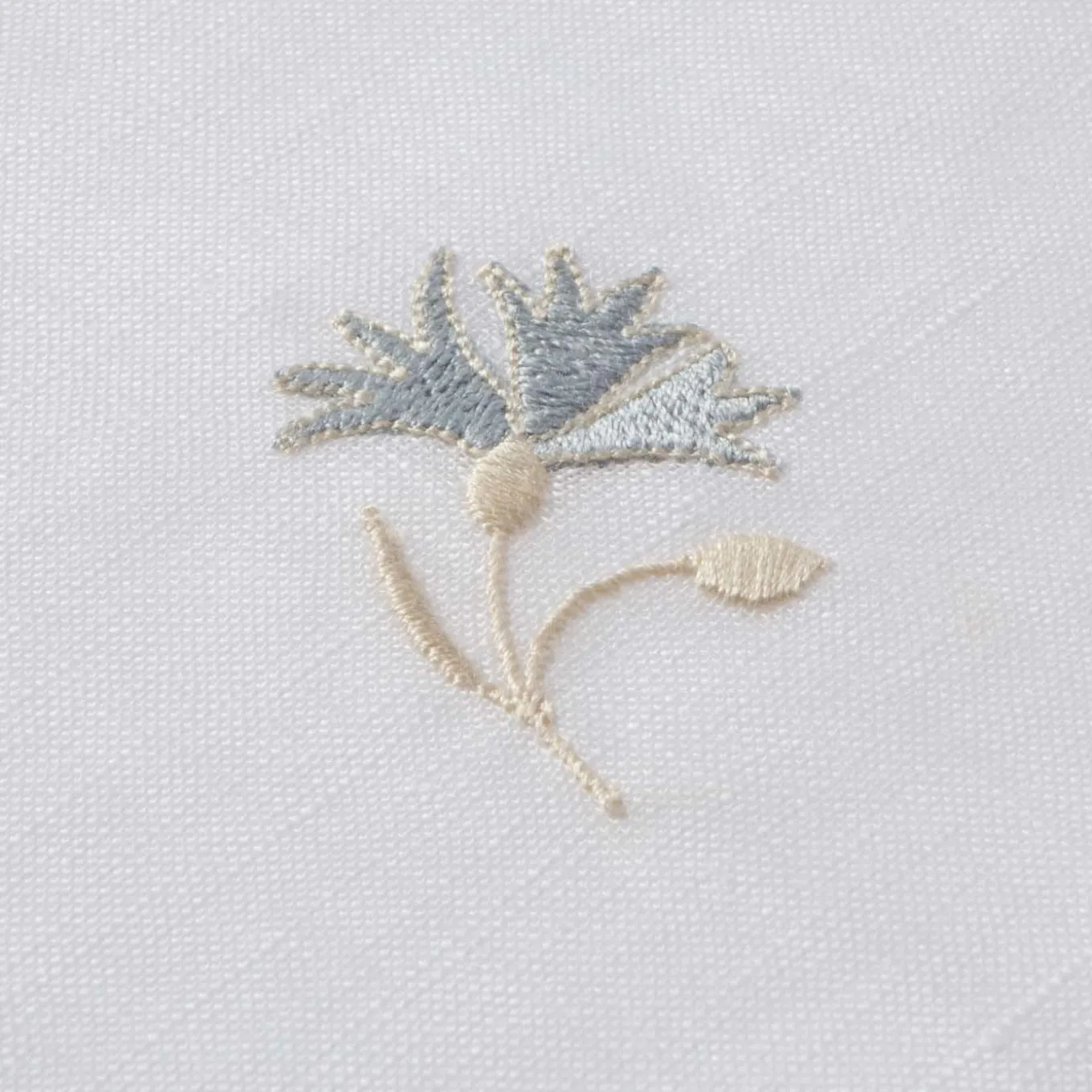 This elegant tablecloth has the romantic style of vintage embroidery, with its delicate floral motifs that are exquisitely rendered with intricate chain-stitching and repeated throughout the entire surface. Each motif is composed of three fleur-de-lis with gold accents, and the light blue color is repeated along the border in a simple linear detail. A truly stunning accent to dress any table in your home. Available in many sizes, please ask the concierge for details and pricing.