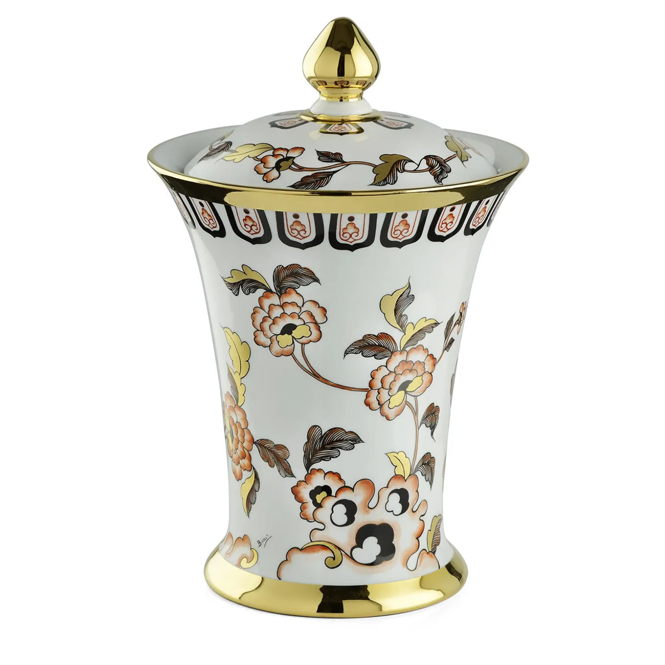 Characterized by the unique and fascinating charm of Chinese decorative tradition, this potiche is handcrafted of fine porcelain, and showcases a graceful and elegant silhouette adorned with 24k gold painted details and with typical Chinese floral decorations of unparalleled sophistication.