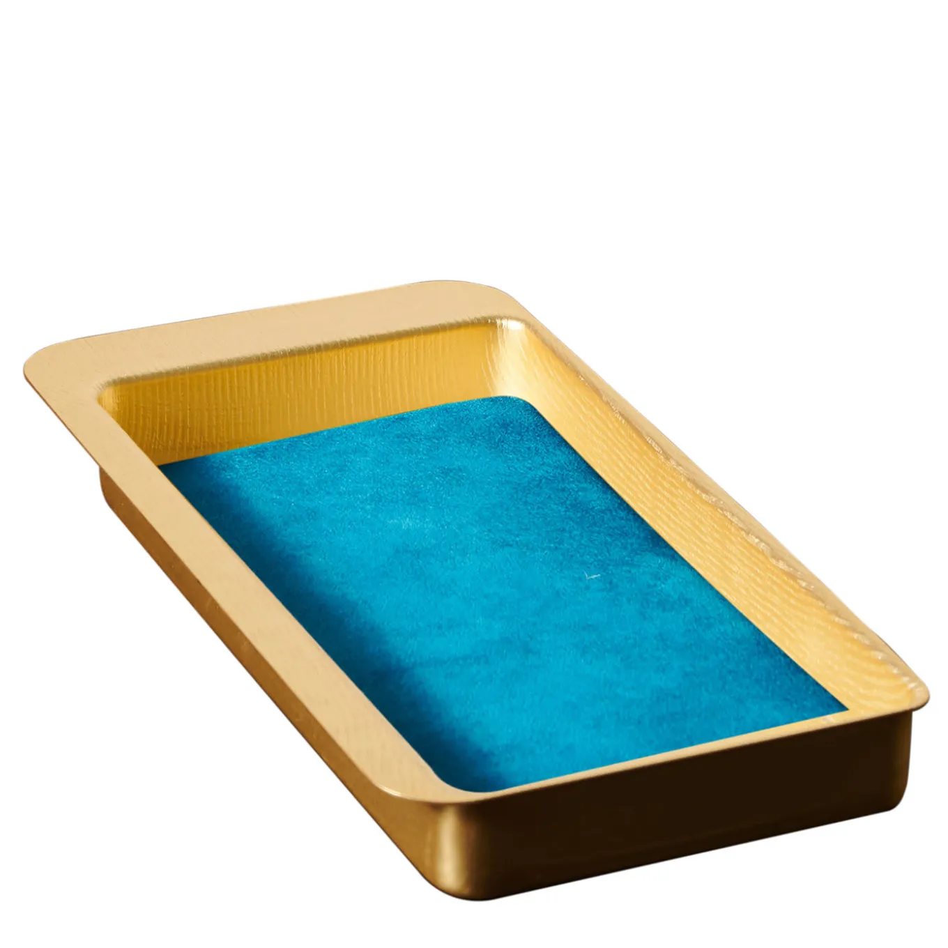 The perfect meeting point between functionality and aesthetic, this gorgeous empty pocket tray will brighten up a contemporary interior with its shiny, gold hue juxtaposed to the intense light blue hue of the fabric pad. Skillfully handcrafted of brass, hammered by hand in a captivating bark-inspired texture, it is also offered in a version made of copper, burnished bronze, or silver alloy. The internal removable pad is available in pink, navy blue, or cream white upon request to the Concierge.
