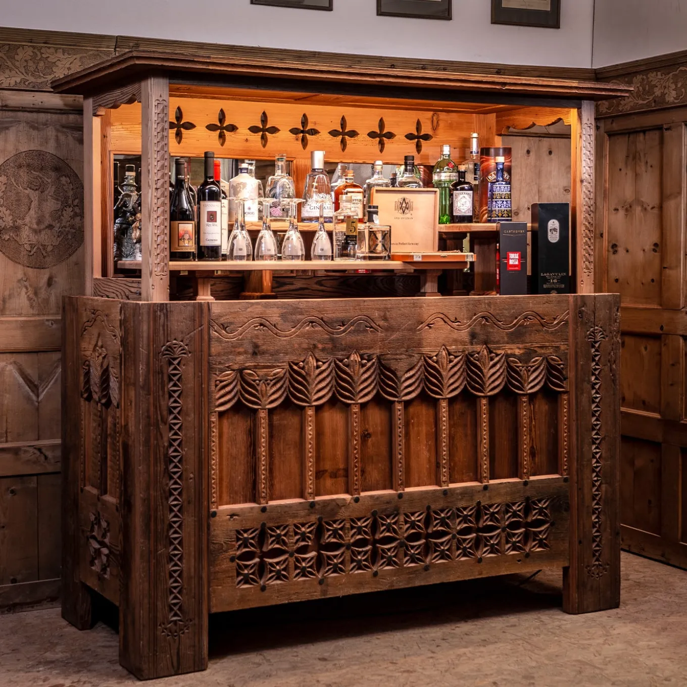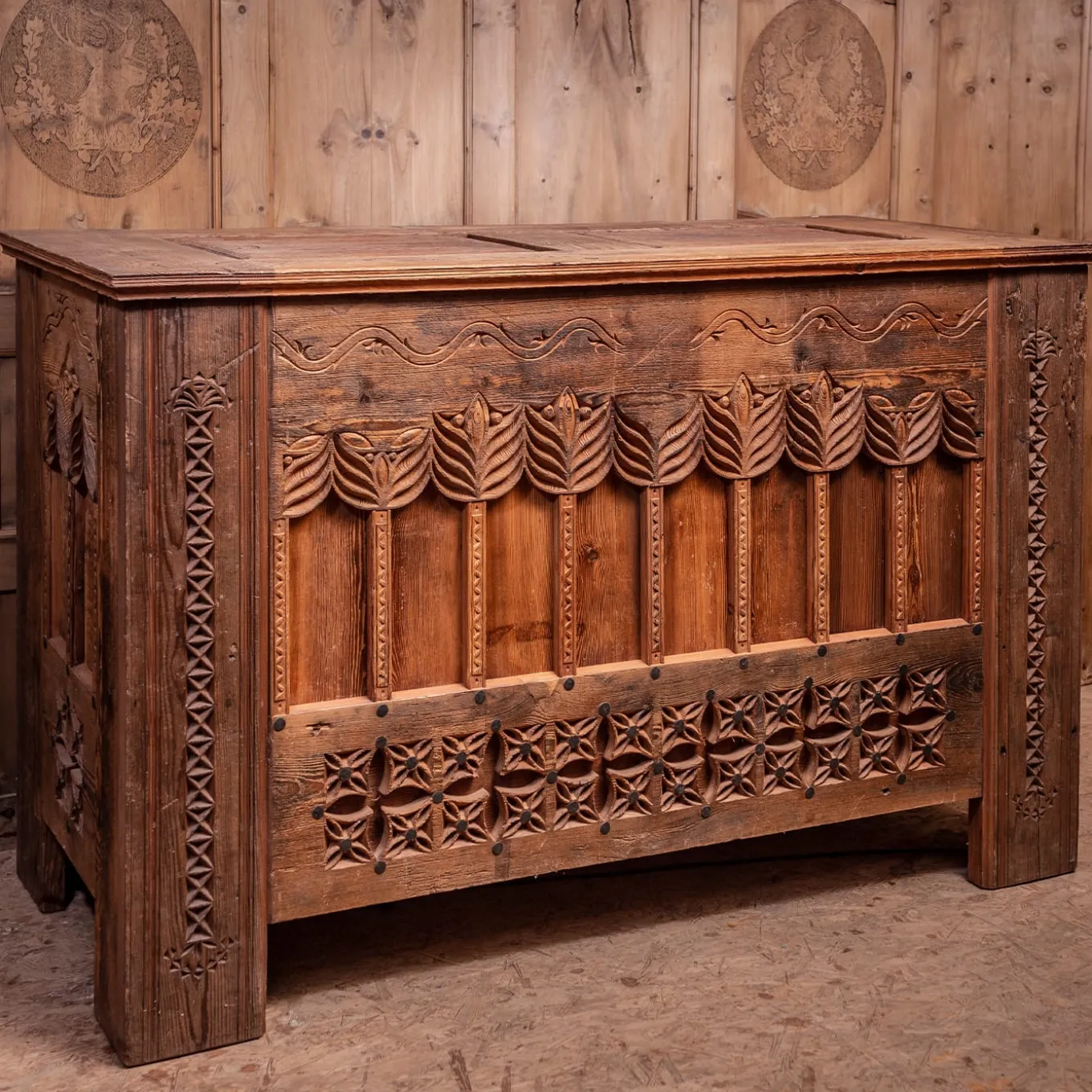 A stunning piece of functional decor, this chest is inspired by the gothic style of the Elsass region in France, bordering with Germany. Its one-of-a-kind allure comes from the larch used to craft it, which is 400 to 600 years old. The hand-carved ornaments on its front and top will imbue a home with a warm and rustic ambiance. The piece opens automatically by pushing a button on the side, thanks a hydraulic system (also available with a remote control upon request). This piece can also be made in a smaller size – please ask the Concierge for details.
