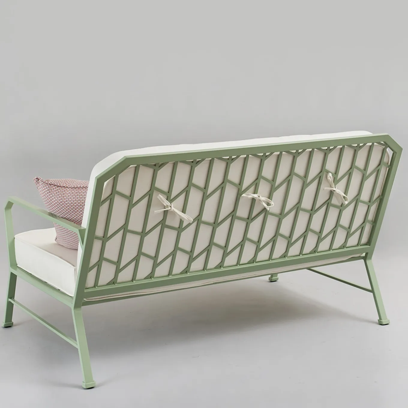 This sofa is dominated by geometric influences and cozy, generously cushioned seat and backrest, both covered in white sunbrella Nattè fabric. A delightful addition to a modern patio or porch, its fresh character is sealed by the soft green hue (RAL 6021) chosen for the powder varnish its stainless steel structure is finished with. A captivating openwork pattern adorns the back.