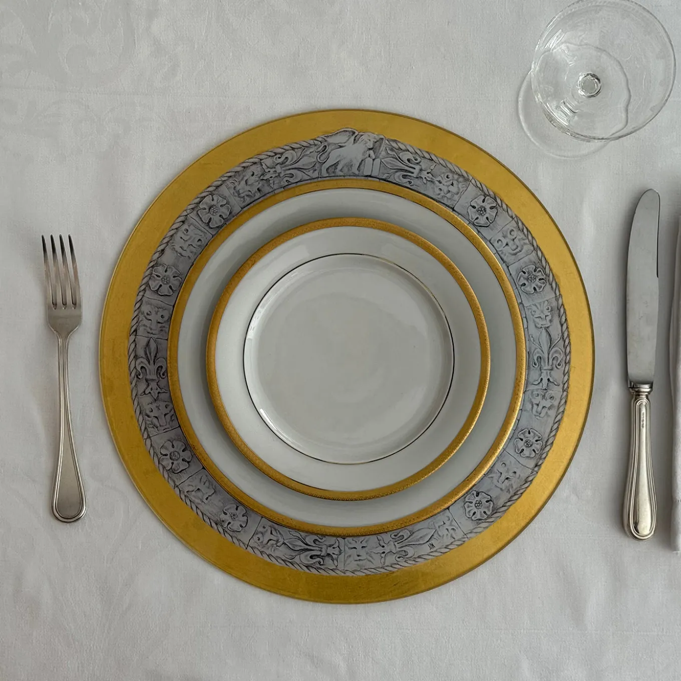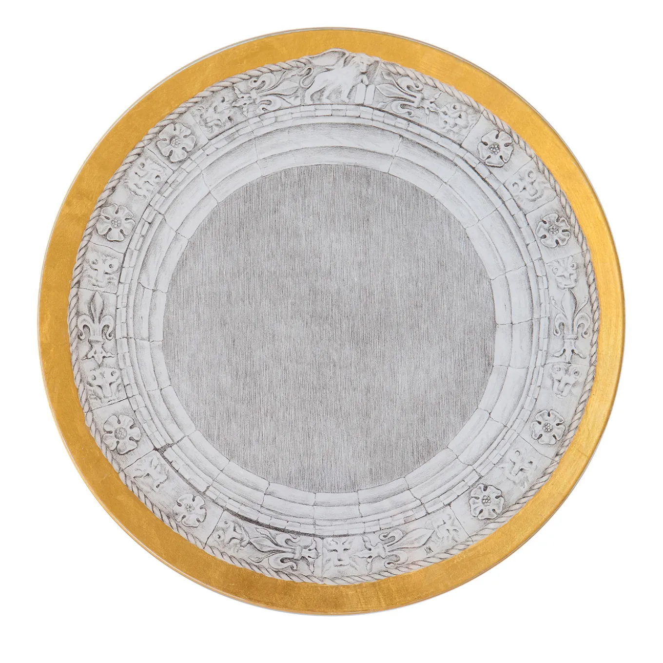 The Frari charger plate is part of the Veneziana collection, inspired by the architectural elegance of Venice. Featuring a design influenced by a rose window of the Basilica di Santa Maria Gloriosa dei Frari, it reinterprets gothic geometry with contemporary graphite and gold leaf details. Crafted with tempered glass, the plate showcases intricate motifs highlighted by 24-karat gold accents that reflect light differently depending on the angle. Suitable as a striking table setting element or a sculptural wall or pedestal display.