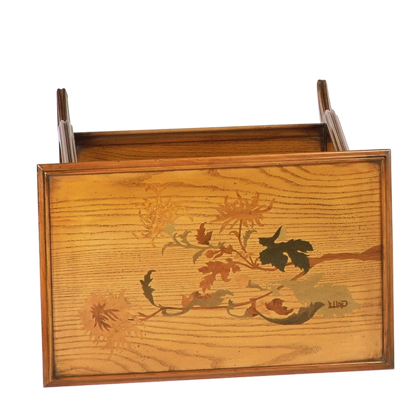 An impeccable reproduction of an Art Nouveau piece (1880-1915) originally designed by Emile Gallè, this rectangular side table makes for a refined solution to complement classic-inspired decors. Three tapered elements characterize the open sides, which sustain the top with exotic inlays and meet the ground by means of slightly curved feet. A practical lower shelf offers extra space.