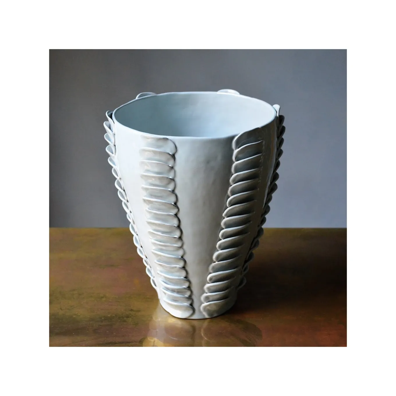 Masterfully glazed and completely handmade using the colombino technique, this sophisticated terracotta vase is part of the Frida collection. It features a simple shape with an ample opening and a soft pale blue glossy finish. The exquisite decoration of overlapping disks running along the side adds a timeless appeal to this highly decorative piece that will make a statement in any decor.