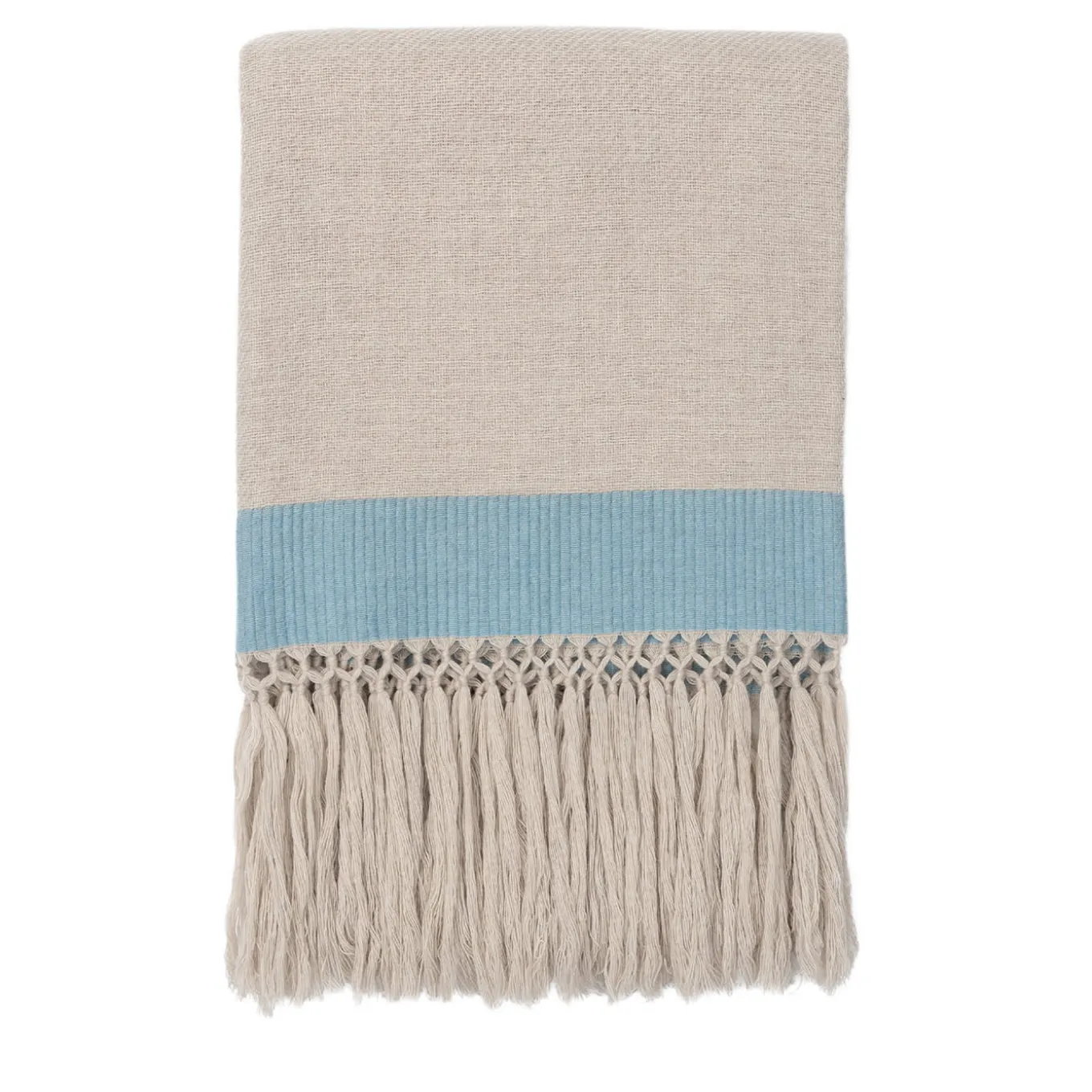 At once rigorous and fancy, this exclusive Merino wool blanket was conceived for maximizing coziness while not renouncing elegance. The light-blue-toned band running all along the 20cm-long hand-knotted fringed border adds a dash of freshness to the piece, softly interrupting its restrained monochromatic look. Different color options are available in the Artemest catalog.