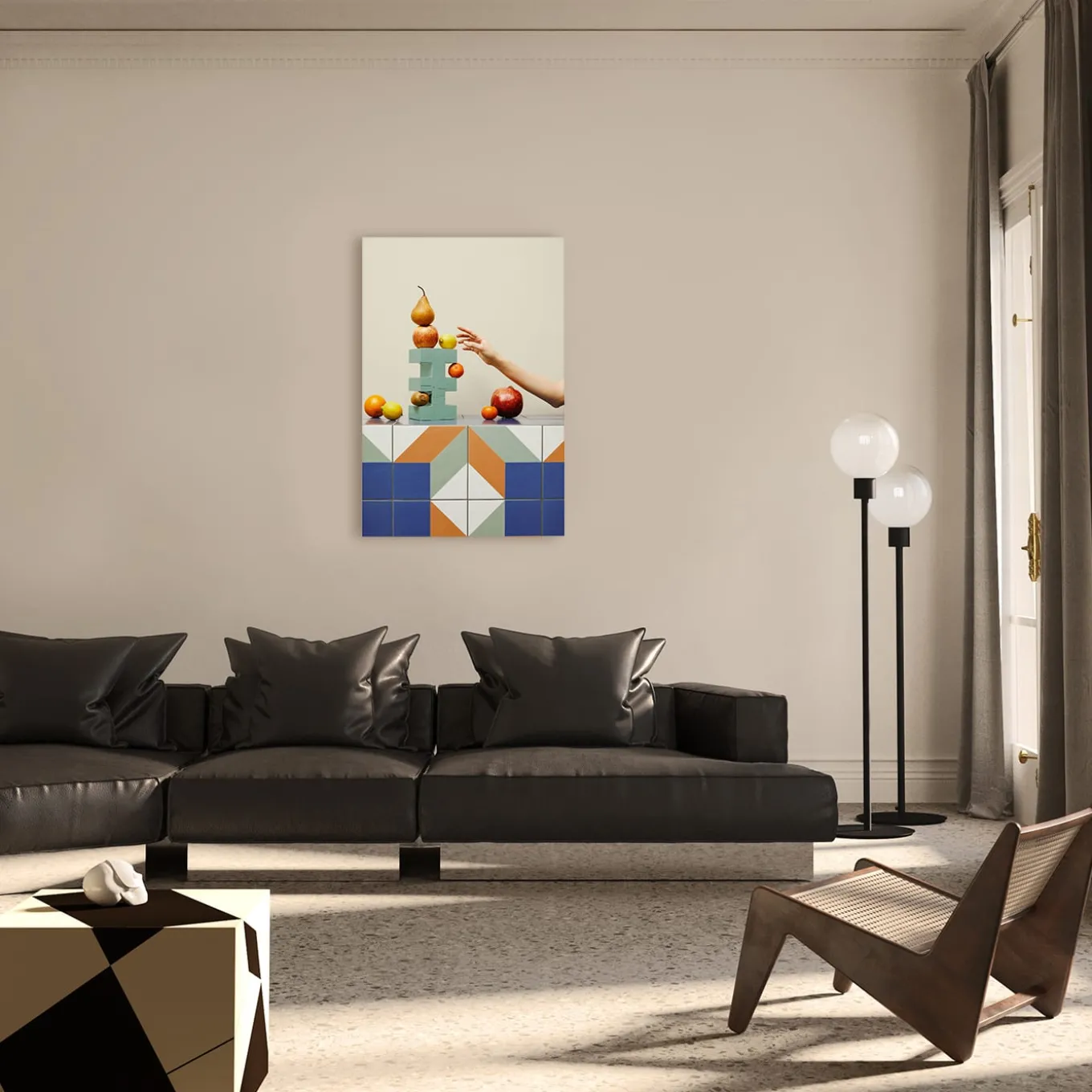 The image represents a still-life. The tabletop is covered by Margherita tiles, designed and projected by Natalie Du Pasquier in collaboration with Mutina Ceramics. The photograph gets printed on FineArt support from a digital file. This is a limited edition of n. 5. Frame not included.